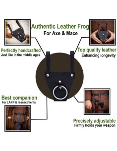 Gemaakt met lederen handgrepen en bevestigd met vernikkelde zachtstalen klinknagels, biedt de kikker een grote houdkracht en comfort. De stalen ring, ook gecoat met nikkel, heeft een diameter van ongeveer 5 cm en zorgt zo voor de stabiliteit van uw bijlen of dolken.