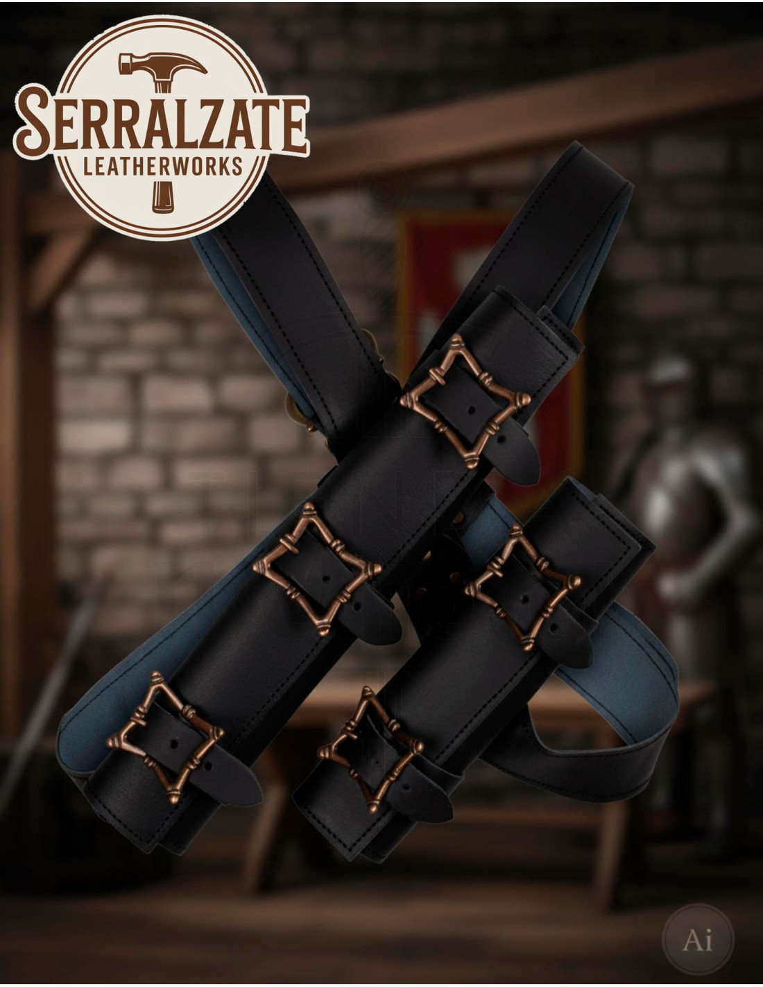 Ontdek de **Dubbel zwaardtasje met riem voor LARP** van Serralzate LeatherWorks, een meesterwerk dat met de hand is gemaakt en speciaal is ontworpen voor degenen die op zoek zijn naar kwaliteit, functionaliteit en stijl. Gemaakt van duurzaam leer en met metalen gespen in een verouderde bronzen afwerking, is dit riemensysteem de perfecte partner voor jouw live avonturen. Het symmetrische ontwerp maakt het mogelijk om comfortabel twee zwaarden te dragen, elk in zijn eigen hoes, waardoor je snel en veilig toegang hebt tijdens evenementen.