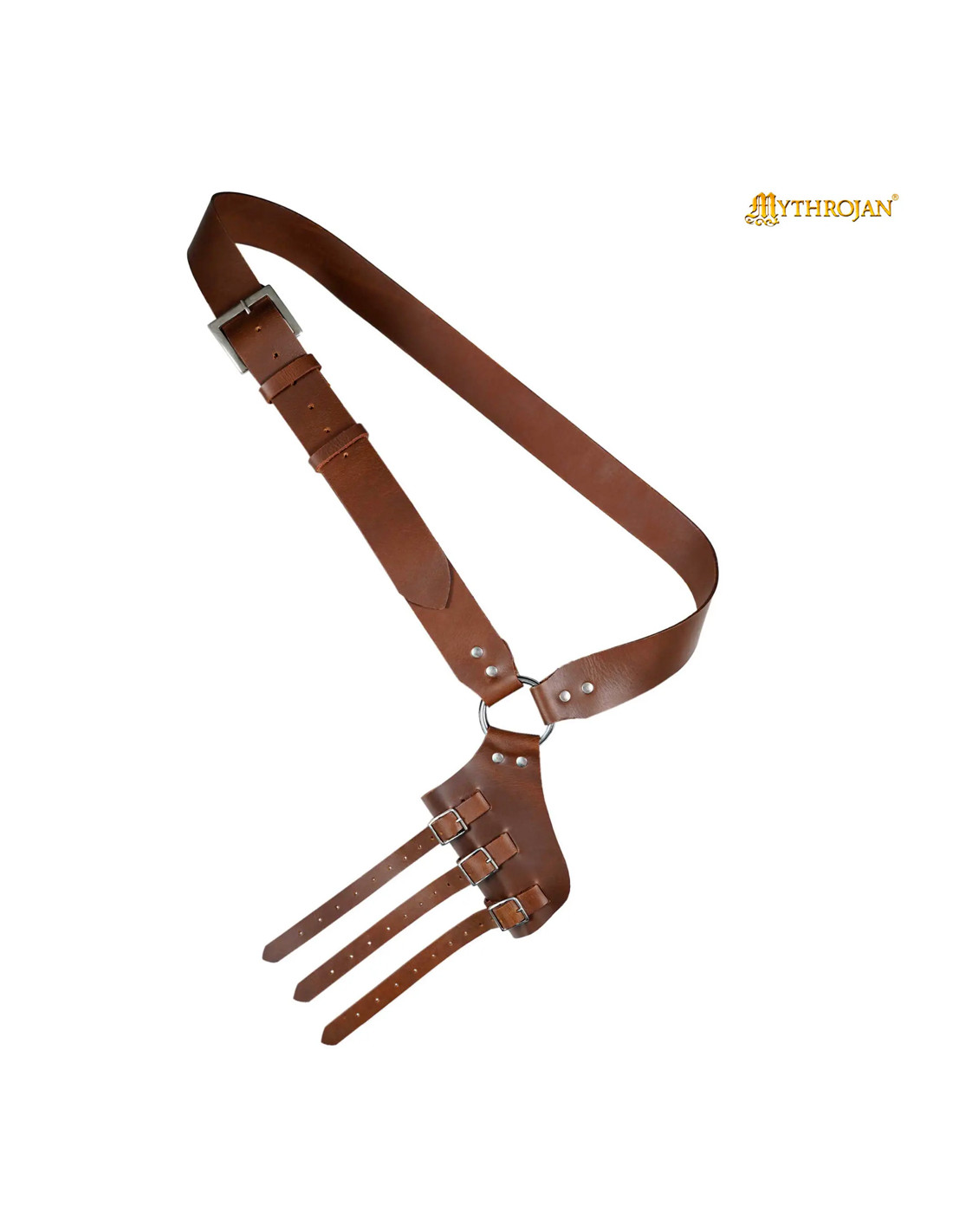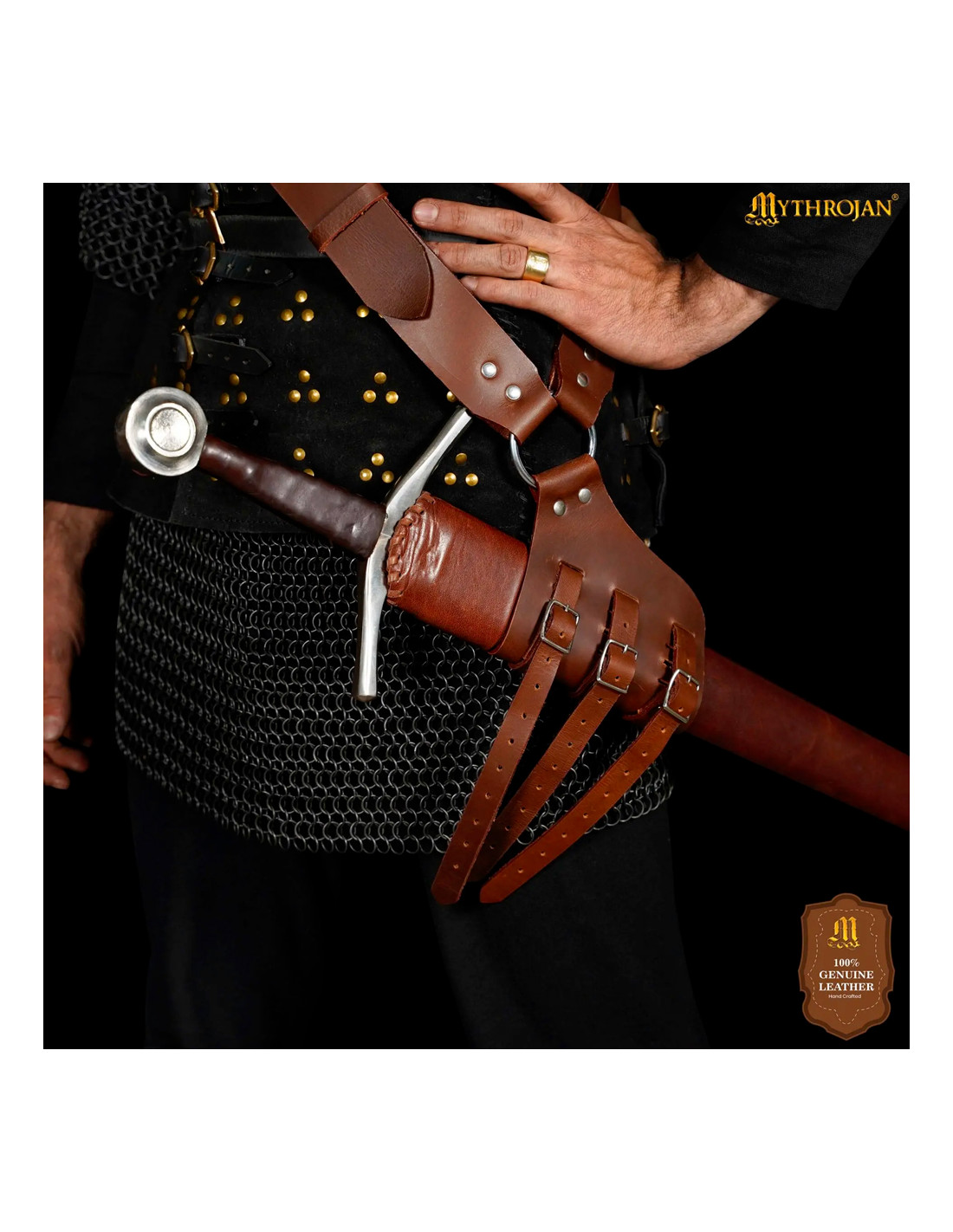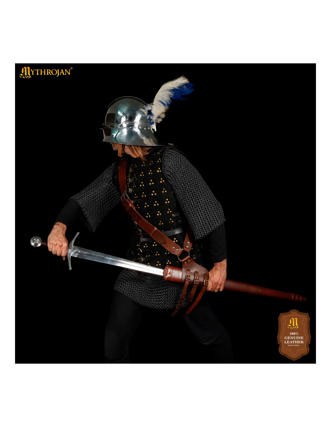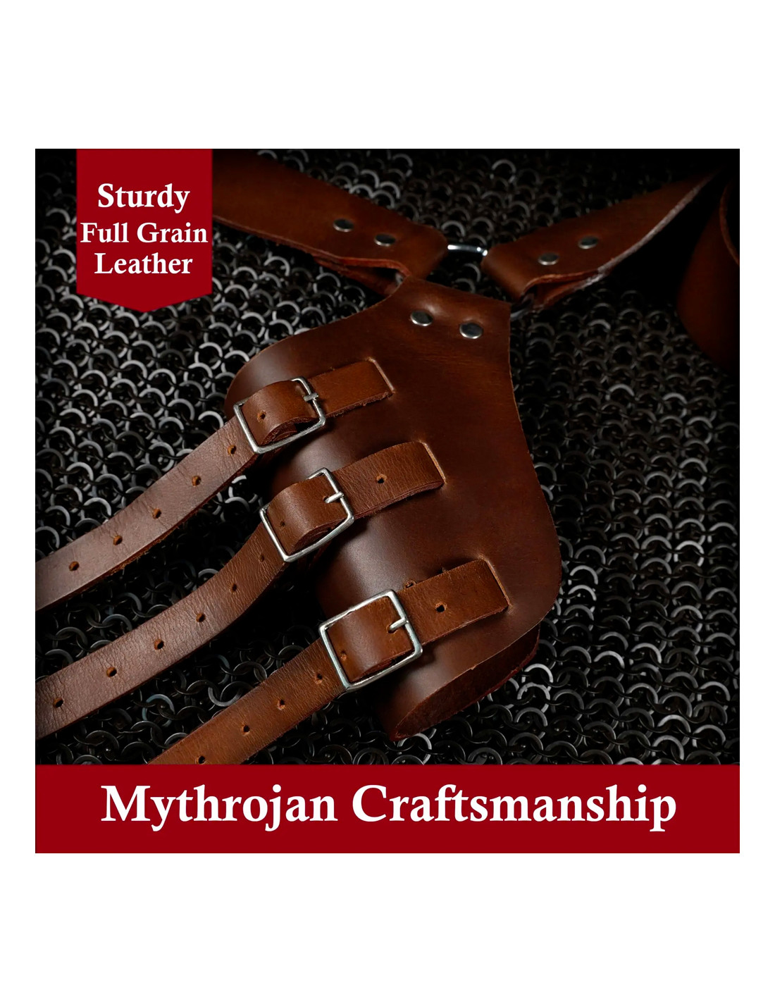 Stel je voor dat je je middeleeuwse outfit aanvult met een accessoire dat perfect stijl en functionaliteit combineert, speciaal ontworpen voor degenen die de traditie in elk detail dragen. Dit bruin leren harnas is bedoeld voor rechtshandigen die er authentiek uit willen zien en hun zwaard altijd binnen handbereik willen houden met maximaal comfort.