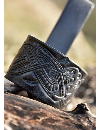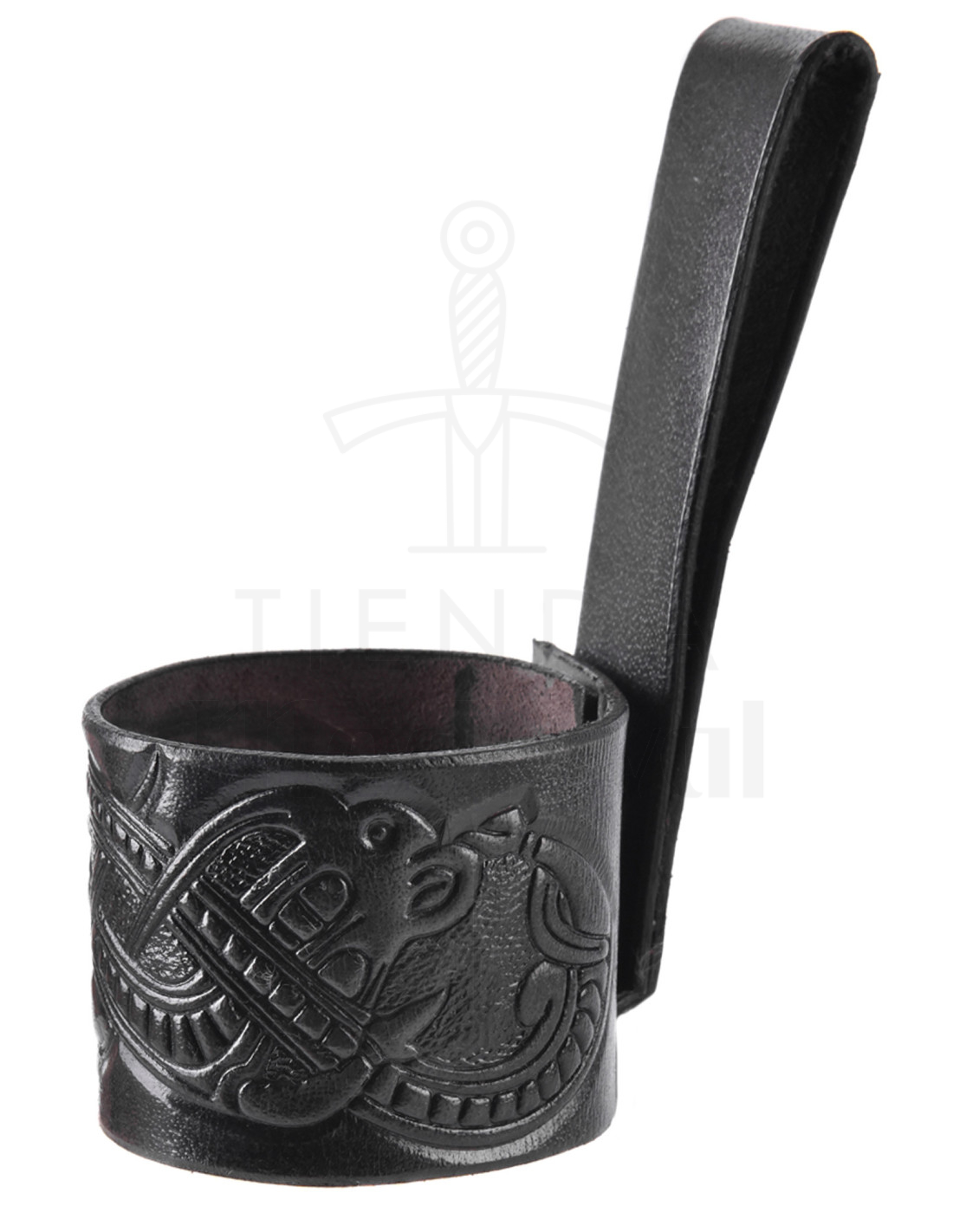 Het meest fascinerende detail is het reliëfmotief dat een draak voorstelt, geïnspireerd op de Jelling-stijl, een ontwerp vol geschiedenis dat verwijst naar de 10e eeuw en de tijd van de Deense koning Gorm. Deze legendarische figuur versiert niet alleen de rand van de houder, maar voegt ook een aura van mysterie en oude kracht toe aan degene die het draagt.