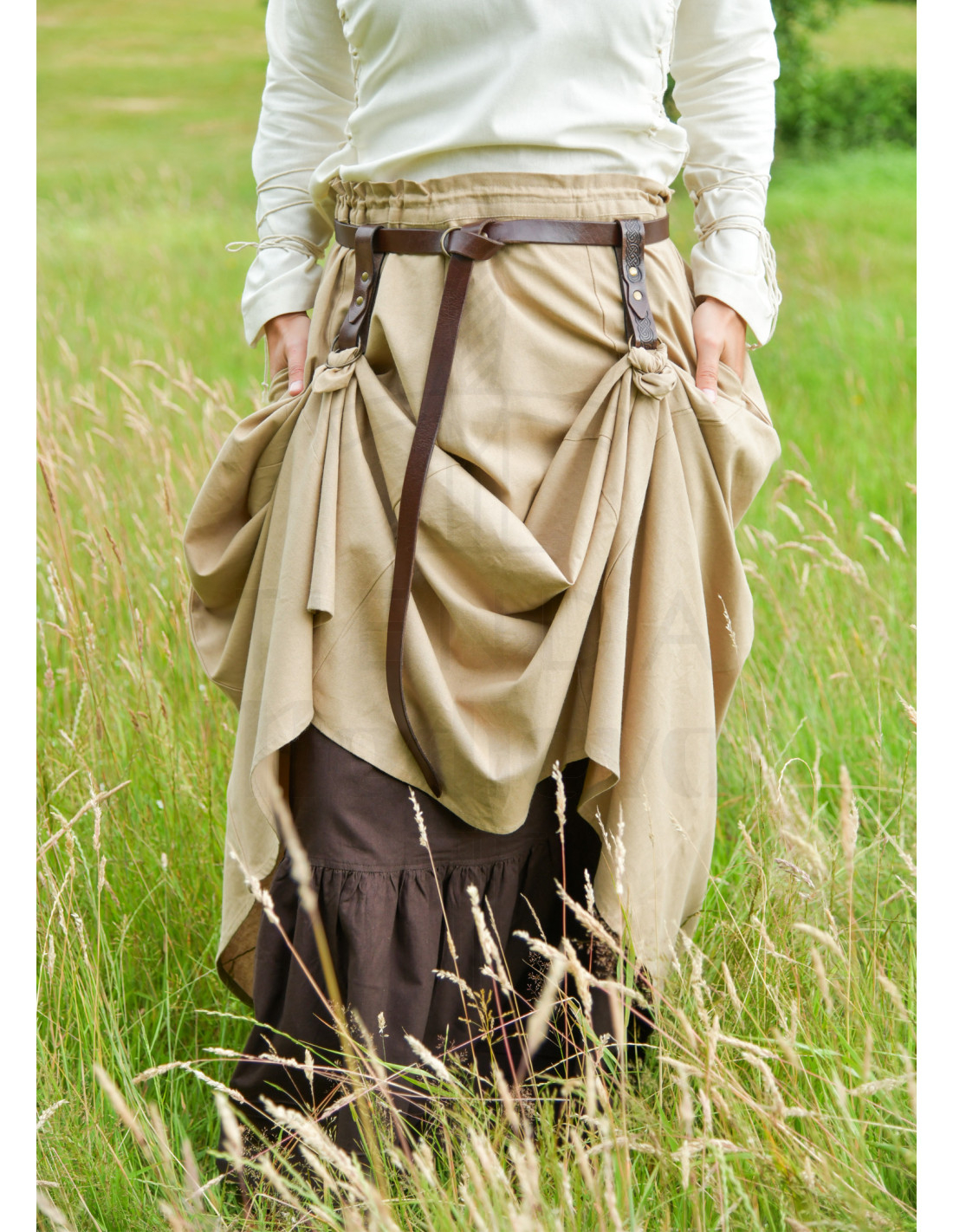 De praktische vorm, met een gesp die gemakkelijk op de taille kan worden aangepast, maakt het mogelijk om de rok op te tillen of te beschermen op warme of regenachtige dagen, en biedt comfort en functionaliteit zonder stijl te verliezen. Ondanks het lichte gewicht is het ontworpen om dagelijks gebruik te weerstaan, terwijl de grootte en vorm het gemakkelijk maken om te dragen en aan te passen. Elk stuk is uniek, met kleine variaties in kleur en textuur, wat nog meer karakter aan elk accessoire toevoegt. Het bruine leer met gravures roept een middeleeuwse esthetiek op, waardoor deze riem een perfect accessoire is voor kostuums, thematische evenementen of voor wie een historische touch aan hun look willen toevoegen.