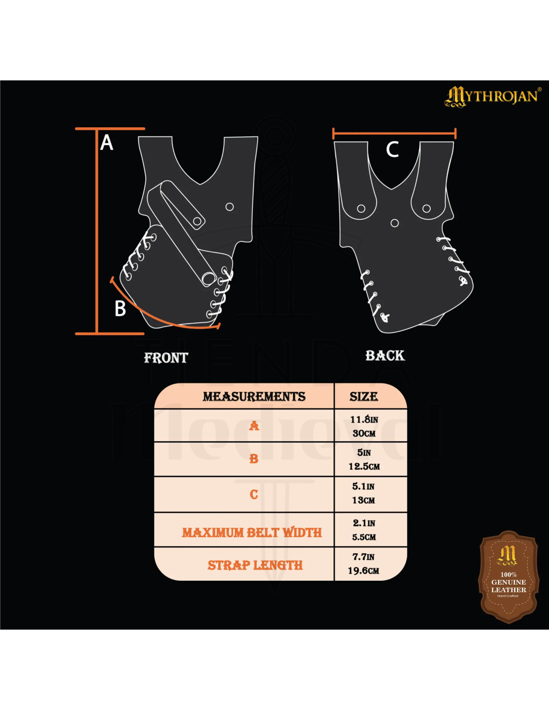 Gemaakt van duurzaam leer, geeft de diepe zwarte afwerking een elegante en veelzijdige uitstraling die past bij elke middeleeuwse of fantasie-kleding. De structuur, die doet denken aan een harnas of borstplaat, biedt bescherming en stevigheid dankzij de verschillende secties en klinknagels die zorgen voor een veilige pasvorm. Daarnaast beschikt het over een vetersysteem aan de onderkant waarmee je het comfortabel kunt aanpassen, zodat het perfect op je torso blijft zitten.