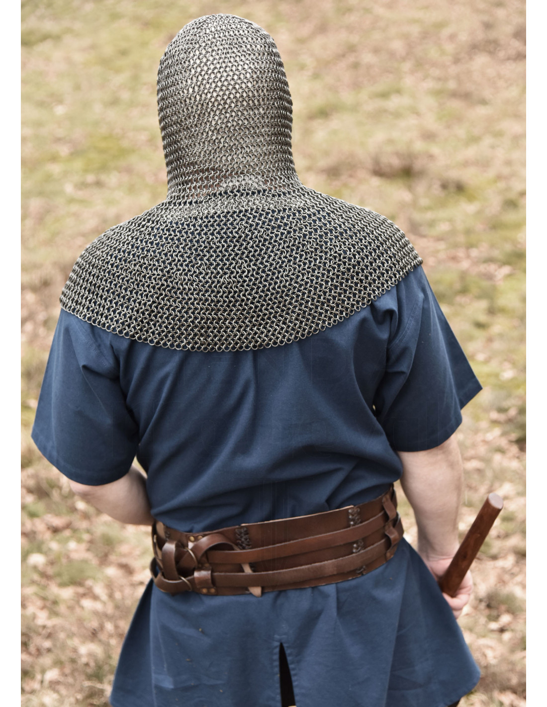 Het ontwerp, geïnspireerd op de ringmail die soldaten begeleidde vanaf de Donkere Middeleeuwen tot het einde van de middeleeuwen, onderscheidt zich door een vierkante gezichtsopening die mobiliteit vergemakkelijkt en een authentiek en trouw uiterlijk aan de periode geeft. Door nauwkeurig de nek en schouders te bedekken, beschermt het deze kwetsbare zones zonder concessies te doen aan comfort of bewegingsvrijheid.