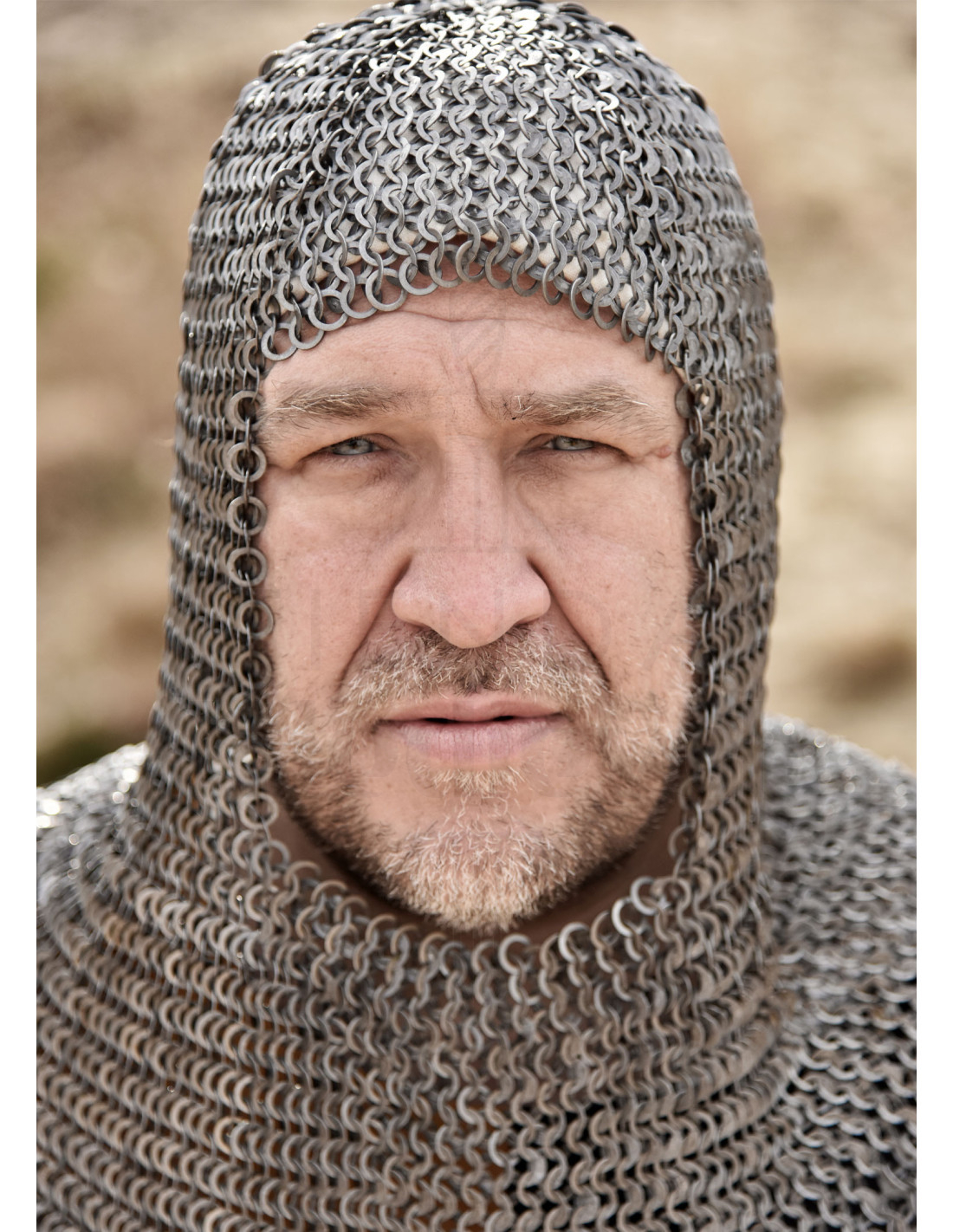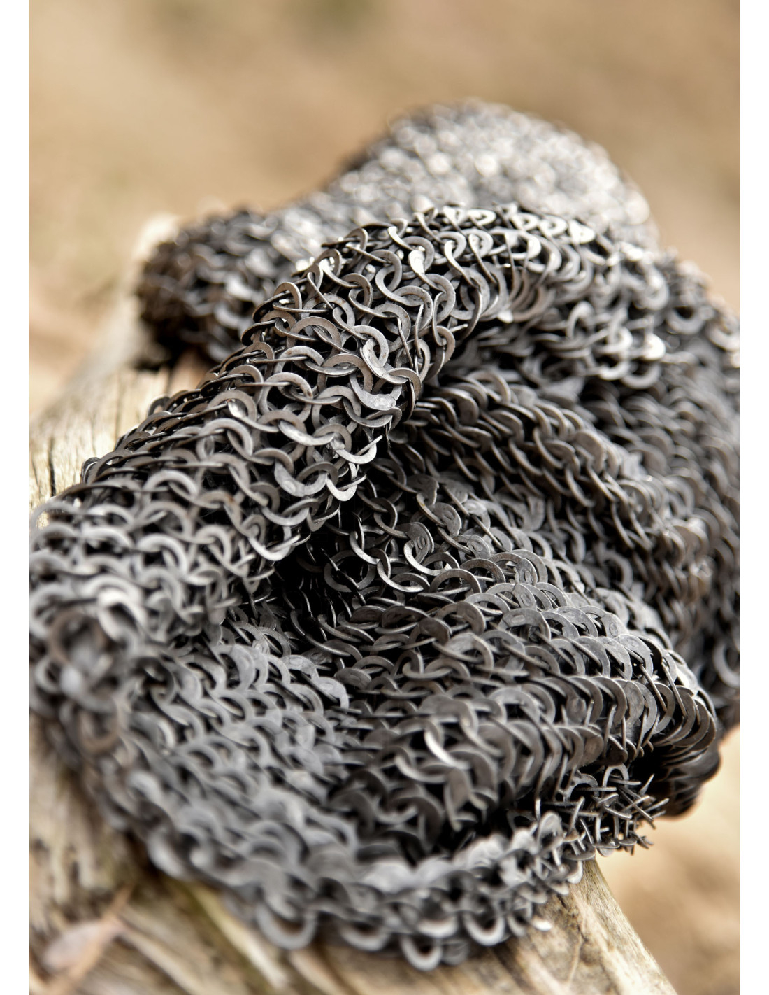 Het ontwerp met een vierkante gezichtsopening garandeert niet alleen een optimaal zicht, maar behoudt ook de historische authenticiteit van de uitrustingen uit die tijd. Dankzij de unieke FWM-gaastechniek, die afwisselend vlakgesoldeerde en geperforeerde ringen combineert, biedt dit stuk een stevige bescherming zonder gewicht toe te voegen, zodat je je soepel kunt bewegen, zelfs in veeleisende situaties.