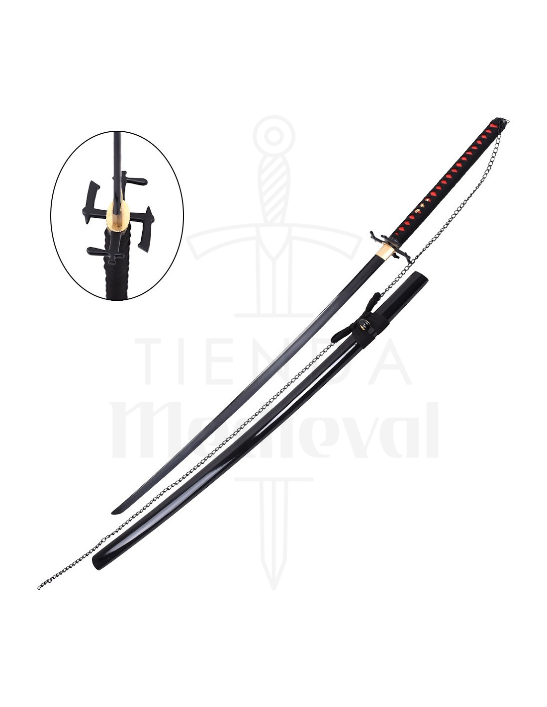Perfect als decoratief element, is hij niet geslepen en niet bedoeld voor snijgebruik, slechts om je passie voor Bleach en zijn universum te tonen. De ketting die aan het handvat is bevestigd, benadrukt zijn ornamentale karakter, ideaal om je collectie of persoonlijke ruimte te decoreren.