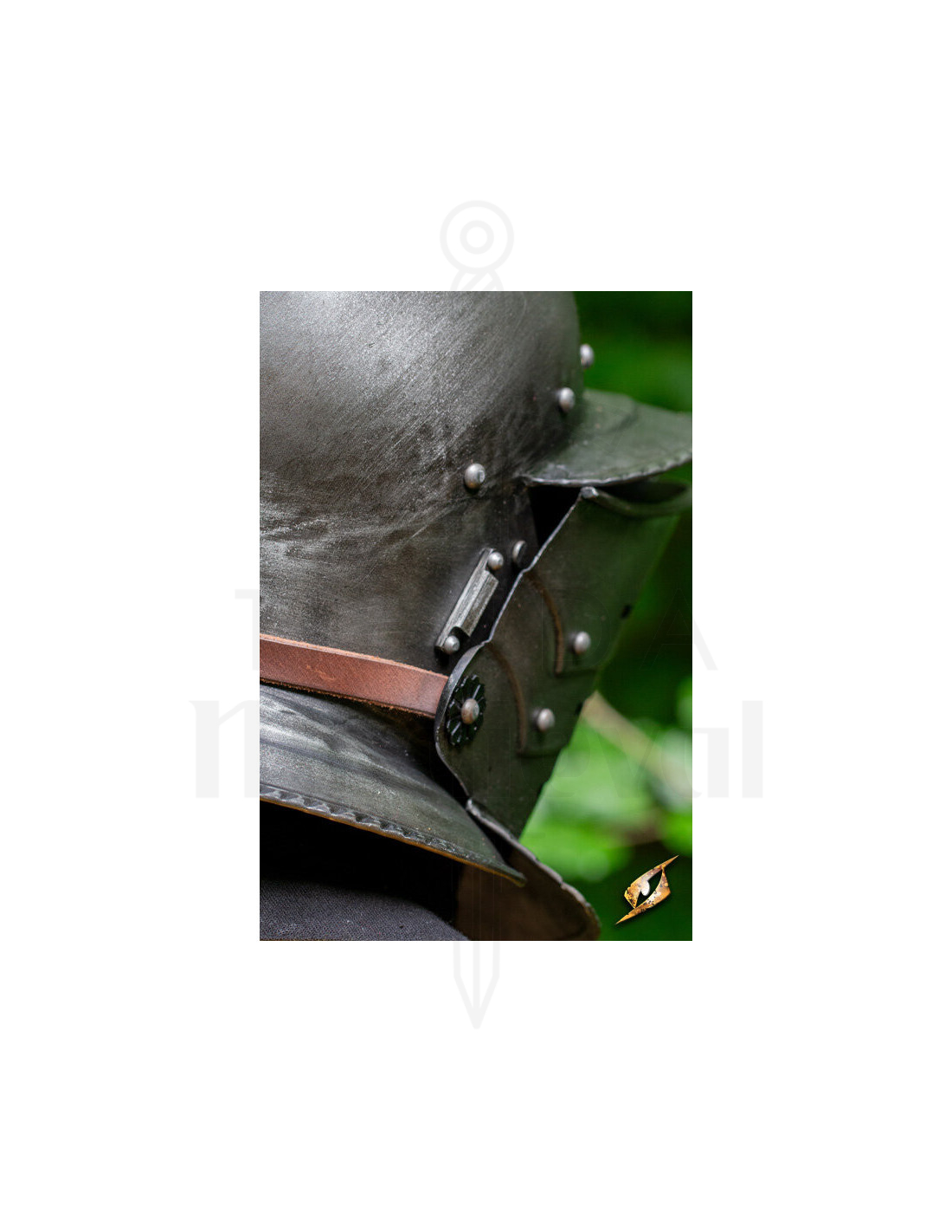 Gemaakt van 1 mm dik staal, geeft de matte zwarte afwerking niet alleen een imposante uitstraling, maar helpt ook corrosie te weerstaan in buitenomgevingen. Het versterkte vizier met openingen biedt een helder zicht en effectieve ventilatie, zodat je comfortabel blijft tijdens lange gevechten of shows. De zichtbare klinknagel-details getuigen van een stevige en duurzame constructie, klaar om intensief gebruik te weerstaan tijdens reenactments of live role-playing sessies.