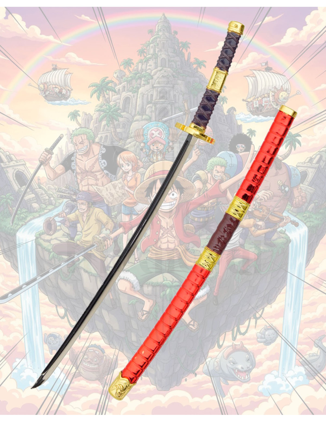 Deze ornamentale replica verwijst rechtstreeks naar het universum van Zoro, het iconische personage van One Piece wiens vechtstijl en zwaarden generaties fans hebben beïnvloed. Voor degenen die op zoek zijn naar een representatief en compact stuk, ideaal om hun passie voor de serie te tonen, is dit een onderscheidende optie.