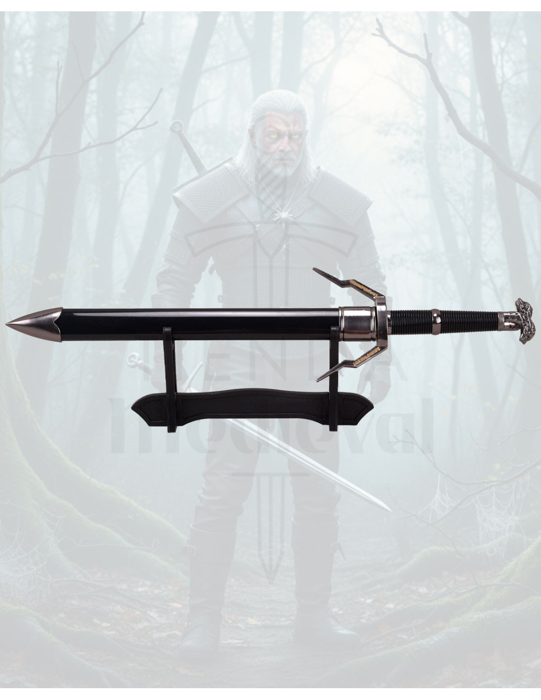 La hoja en acero muestra una punta recta y afilada, con grabados y símbolos que cuentan historias en cada mirada, lo que convierte la contemplación en una experiencia casi narrativa. La guarda, con sus extremos curvados hacia arriba y acabado en níquel, aporta una silueta distinguida que parece emerger de las páginas del universo del brujo.