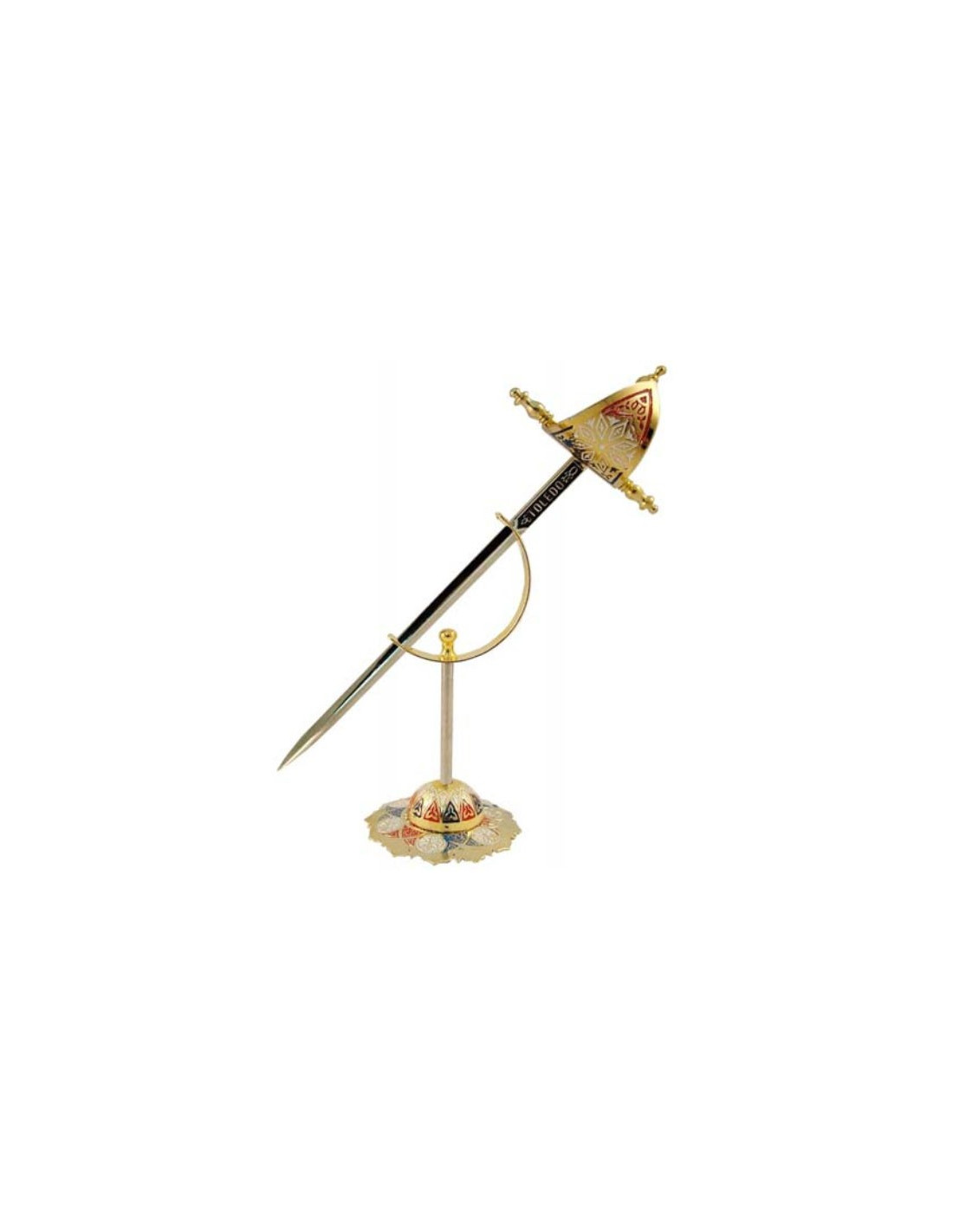Een replica die presence en verfijning combineert, perfect voor wie een detail zoekt dat opvalt zonder te veel ruimte in te nemen. Het contrast tussen het donkere blad en het witte handvat met ruitpatroon creëert een onmiddellijke visuele impact, ideaal voor degenen die een elegante stuk willen dat voor zichzelf spreekt.De gouden decoratie op de guard, de...