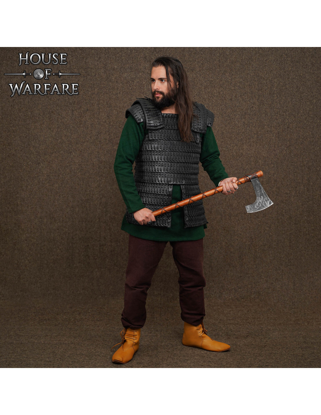 Deze lamelleninterpretatie, geïnspireerd op de beschermingen die door Vikingen, Russen en steppenruiters werden gebruikt, vormt overlappende platen tot een flexibele barrière, ontworpen zodat je je kunt bewegen, vechten of optreden zonder beperkingen. Echt leer biedt duurzaamheid en een natuurlijke flexibiliteit, zodat je zult merken hoe het elke draai en elke stap ondersteunt in plaats van je te beperken.