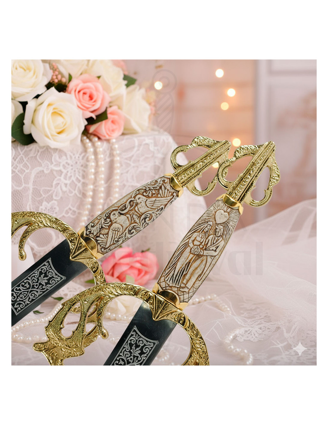 Het bevat de standaardtekst "RDO. DE NUESTRO ENLACE", die een persoonlijk en uniek tintje zal geven aan dit zeer speciale zwaard.