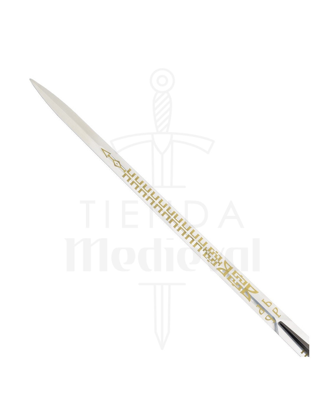 De metalen kling weerkaatst het licht met een gepolijste afwerking en toont gouden inscripties die de blik aantrekken, wat een gevoel van adel en mysterie met zich meebrengt. Deze decoratie is niet alleen esthetisch, maar straalt de indruk uit van een zwaard met karakter, perfect voor degenen die op zoek zijn naar een replica met aanwezigheid om tentoon te stellen of om scènes realistisch na te spelen.
