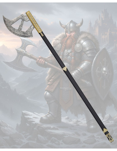 Deze replica vangt het ruwe en bewerkte uiterlijk van het meest memorabele wapen voor fans, met een metallic afwerking die aderen en veroudering simuleert, zodat het stuk eruitziet alsof het uit een dwergen smederij komt. Het asymmetrische ontwerp van het blad en de openingen in de structuur creëren een spel van licht en schaduw, dat karakter en aanwezigheid toevoegt zonder de decoratieve elegantie te verliezen.