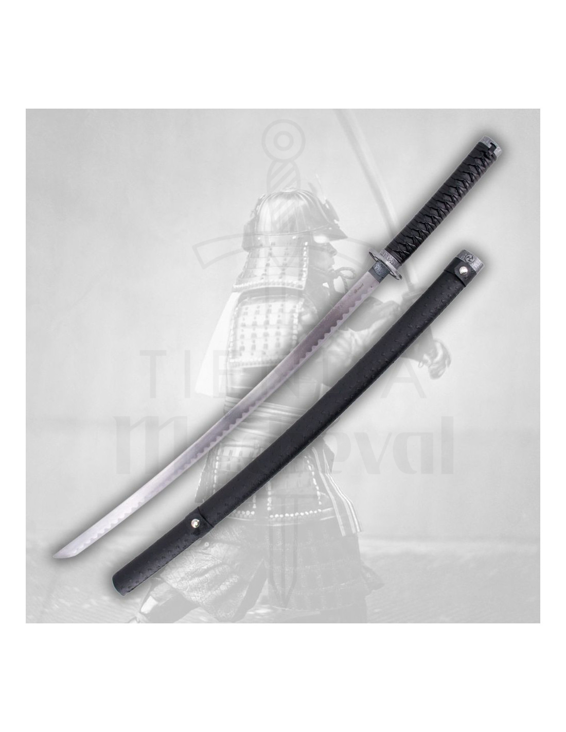 Deze decoratieve katana van 101 cm is een uitstekende keuze voor liefhebbers van replica zwaarden. Met een elegante zwarte schede en een inbegrepen standaard is hij ontworpen om stijlvol tentoongesteld te worden in elke ruimte. Het zorgvuldig afgewerkte en dikke staal van het lemmet weerspiegelt duurzaamheid en kwaliteit, terwijl de handgreep, omwikkeld met zwart kunstleer, een verfijnde en authentieke uitstraling biedt.