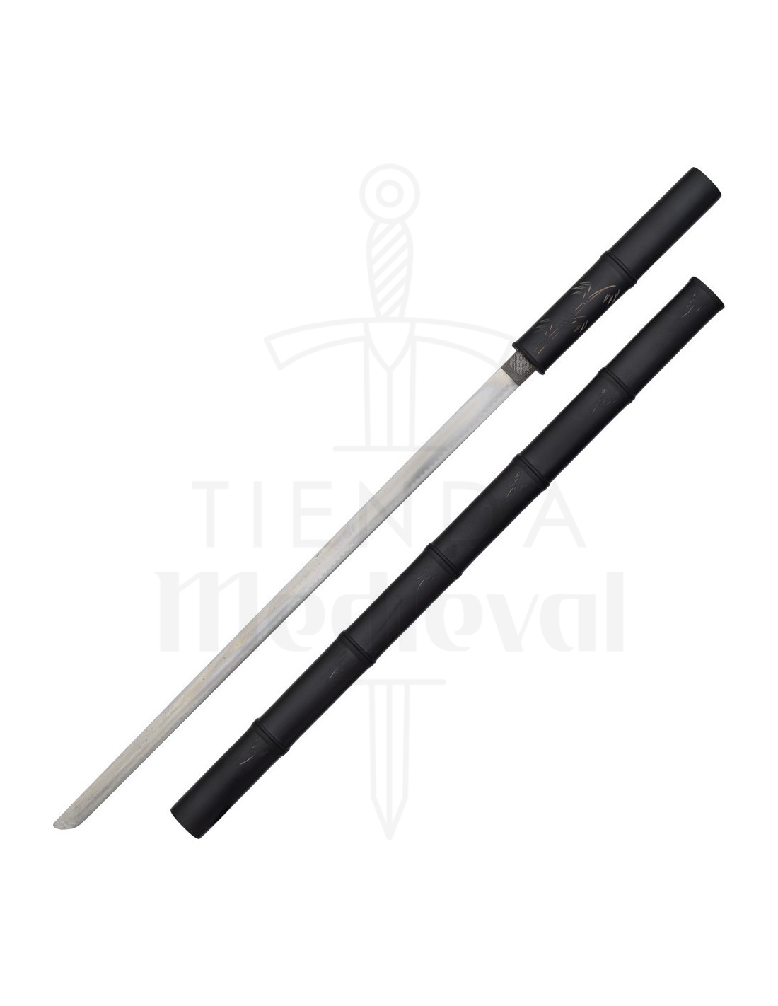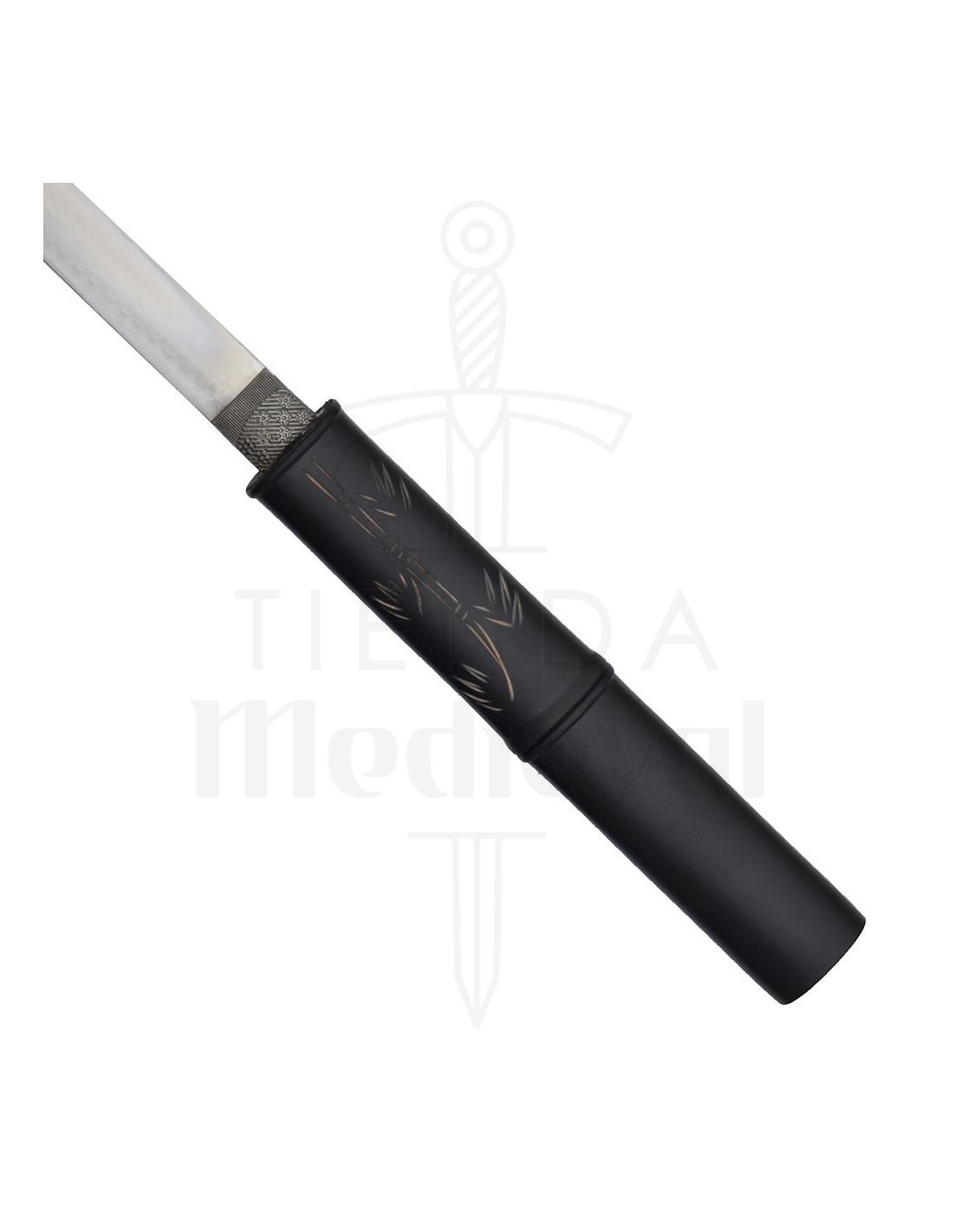 Ben je op zoek naar een mysterieuze en elegante toets voor je collectie of decoratie? Dit exemplaar, geïnspireerd op de Japanse esthetiek, combineert een uniek decoratief ontwerp met een afwerking die een zwarte bamboe schede nabootst, waardoor een verfijnd en raadselachtig uiterlijk ontstaat. De ornamentale katana, model schede ontwerp bambu zwart, heeft een houten handvat met een gegraveerd detail dat een ambachtelijke uitstraling geeft, terwijl het niet-geslepen stalen blad de louter decoratieve functie benadrukt.