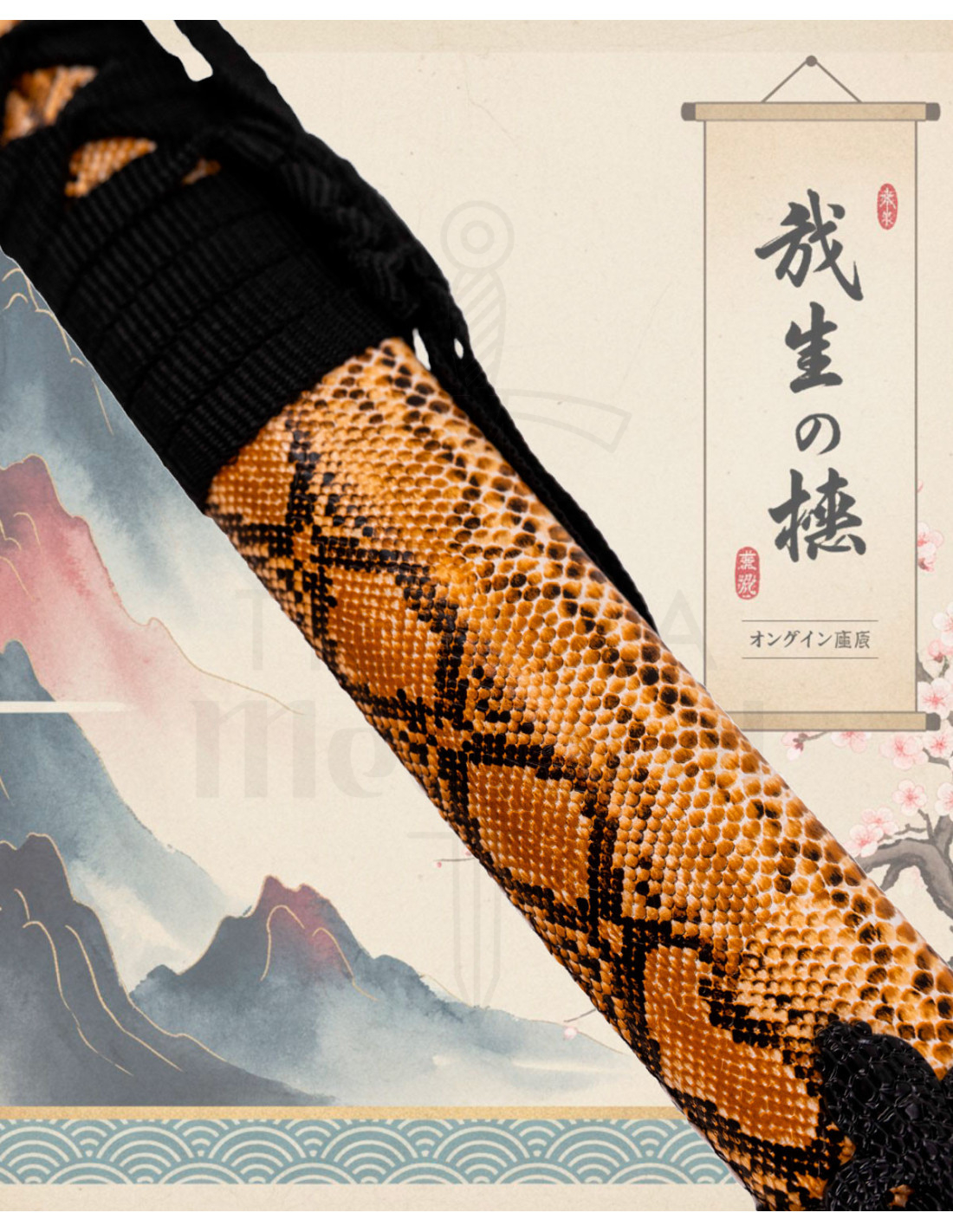 De schede combineert duurzaam zwart nylon met een imitatie leren schede in lichte bruintinten, versierd met donkere patronen die natuurlijke schubben nabootsen, en metalen bevestigingen in zwart die een stevige bevestiging garanderen. Deze combinatie vergemakkelijkt het vervoer en houdt het stuk beschermd, terwijl het tegelijkertijd zijn onderscheidende esthetiek versterkt.