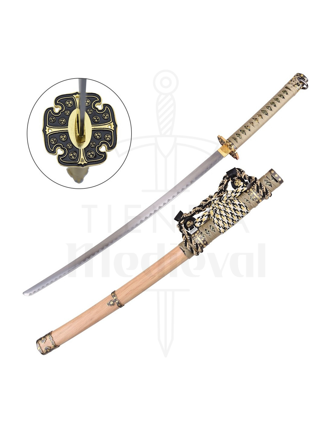 De vierkante garde, met afgeronde hoeken en cirkelvormige en bloemmotieven in zwart en goud, fungeert als een centraal detail dat traditie en design in evenwicht houdt, en voegt een decoratief element toe dat het stuk versterkt. De handgreep, omwikkeld met beige gevlochten touw in een kruispatroon, biedt niet alleen een ambachtelijke uitstraling, maar de textuur maakt het gemakkelijker om de greep stevig vast te houden, waardoor het visuele en praktische gebruiksgemak bevorderd wordt. De schede heeft een afwerking van beige, zwart en wit, versierd met gouden metalen elementen die het zwaard beschermen en verfraaien, ideaal om het stijlvol tentoon te stellen.