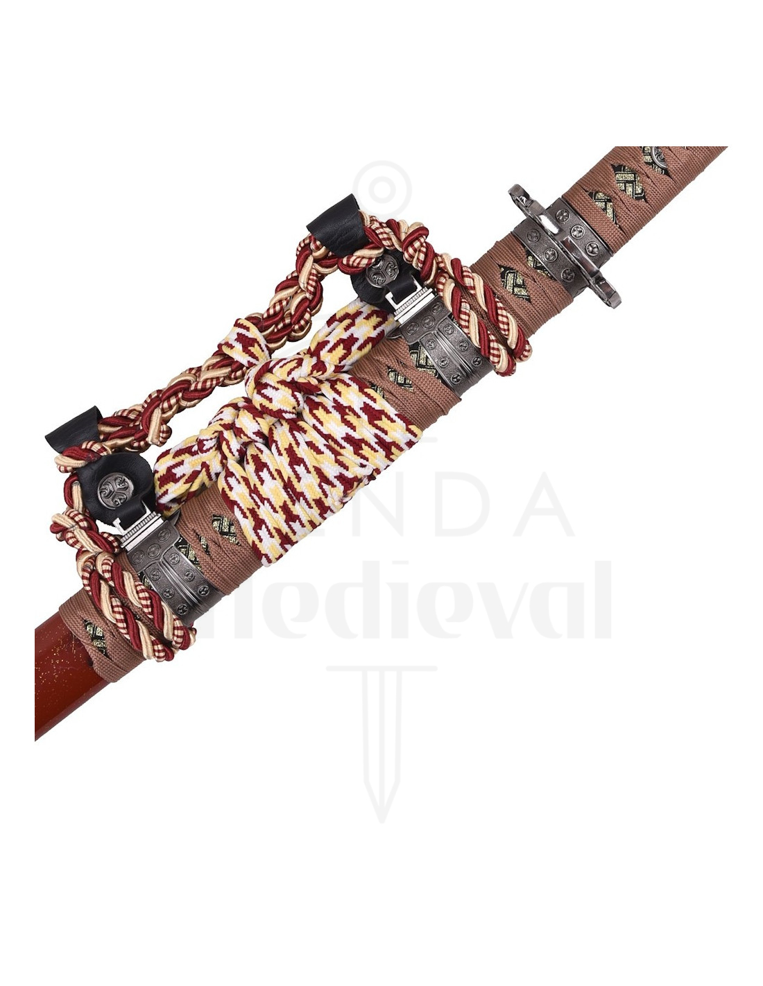 De schede versierd met koorden in wit, rood en bruin, en de metalen afwerkingen, tillen het stuk naar een harmonieuze samenstelling, wat het plaatsen als aandachtspunt in een studeerkamer, woonkamer of kantoor vergemakkelijkt. De details gewikkeld in de mond van de schede en aan de uiteinden verwijzen naar de traditie, en bieden een coherente afwerking die gewaardeerd wordt door verzamelaars en liefhebbers van de Japanse stijl.