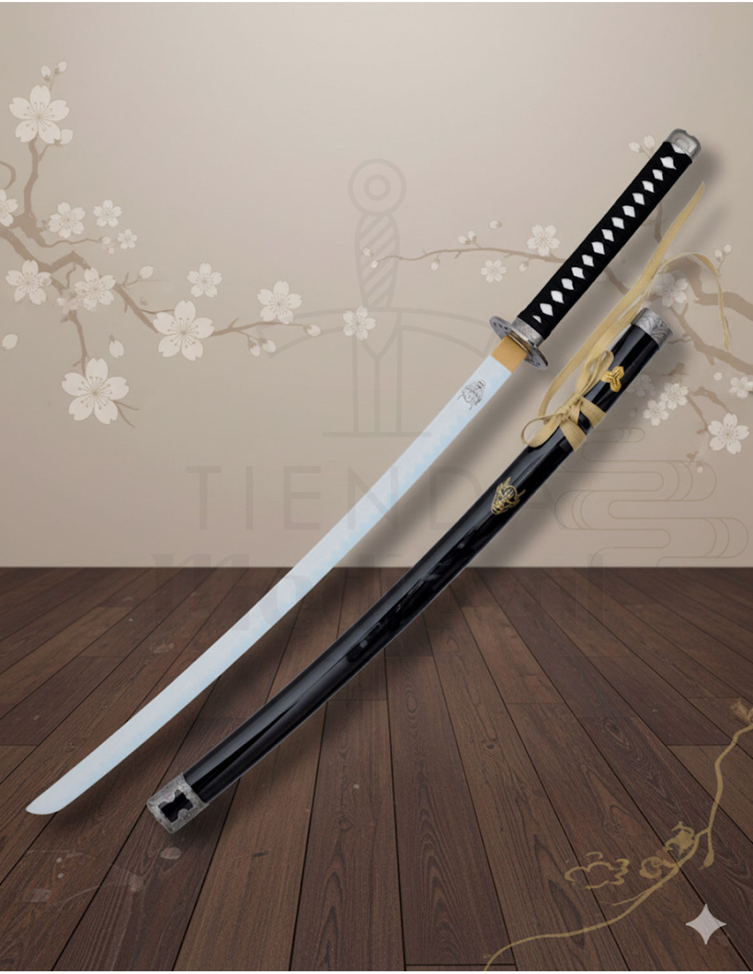 De glanzende zwarte schede, aangevuld met een lichte decoratieve strik, maakt het gemakkelijk om deze in je collectie te tonen of te gebruiken als thematisch stuk voor evenementen of cosplay. Het blad van 680 mm, met een licht en uitgebalanceerd gewicht, zorgt voor een realistische uitstraling zonder je manoeuvreerbaarheid in gevaar te brengen. Bovendien geeft de totale lengte van 990 mm en de bamboe beschermkap een authentieke en elegante uitstraling.