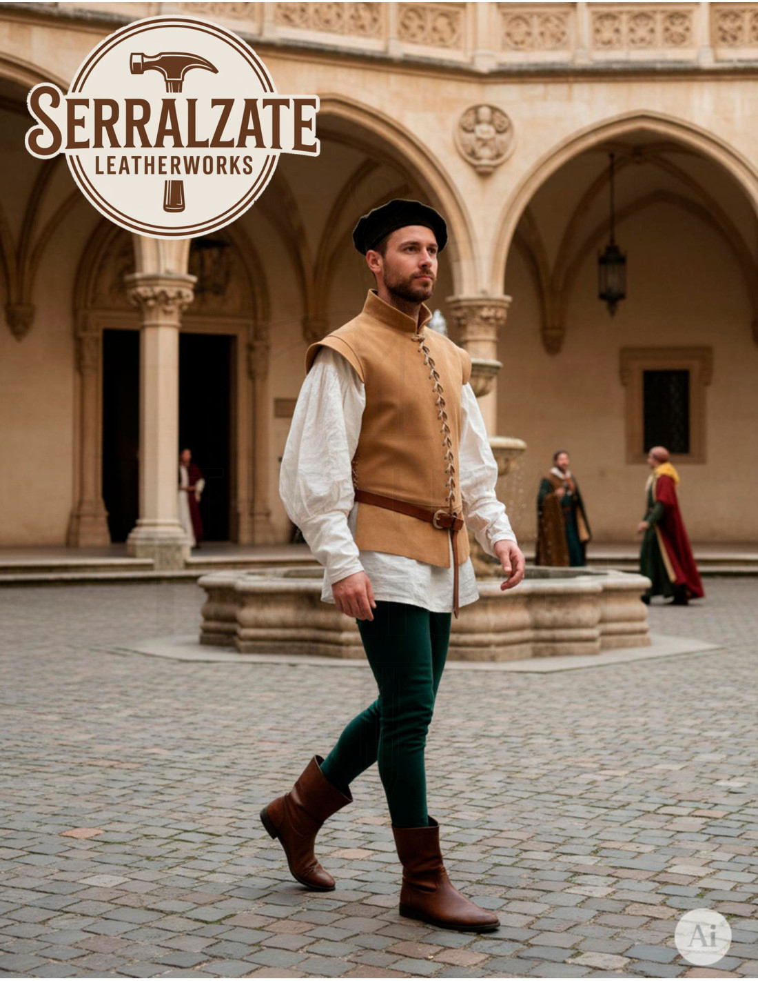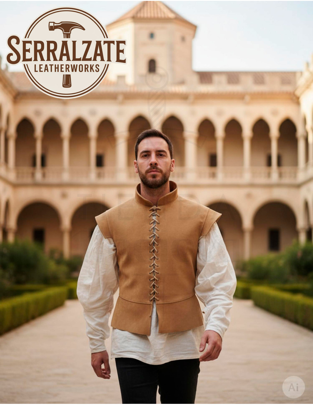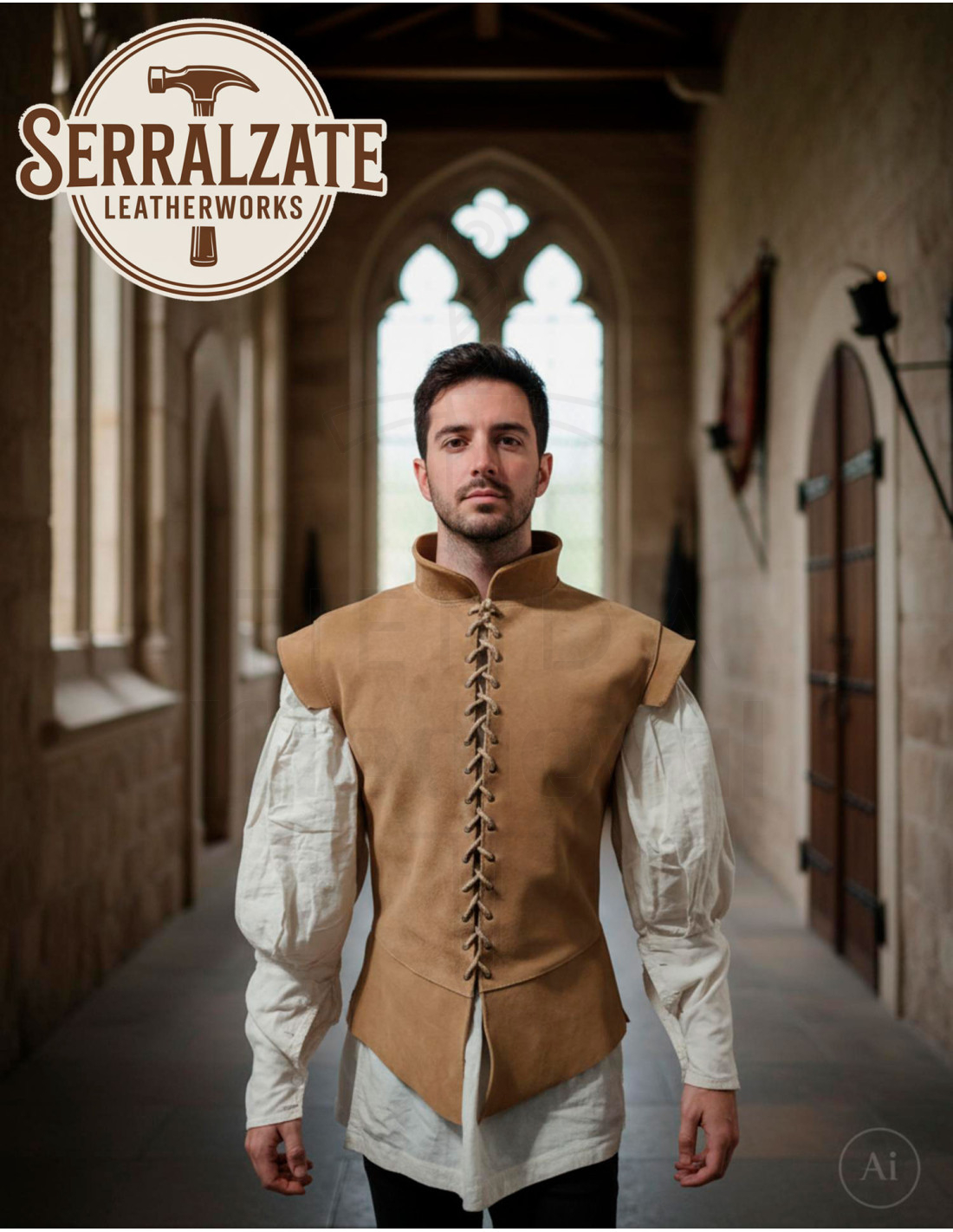 Wil je een middeleeuwse en renaissancistische jas van lichtbruin suède kopen? Dit stuk belooft je uitstraling te transformeren met karakter en vertrouwen, en voegt een vleugje erfgoed en vakmanschap toe aan elke steek.