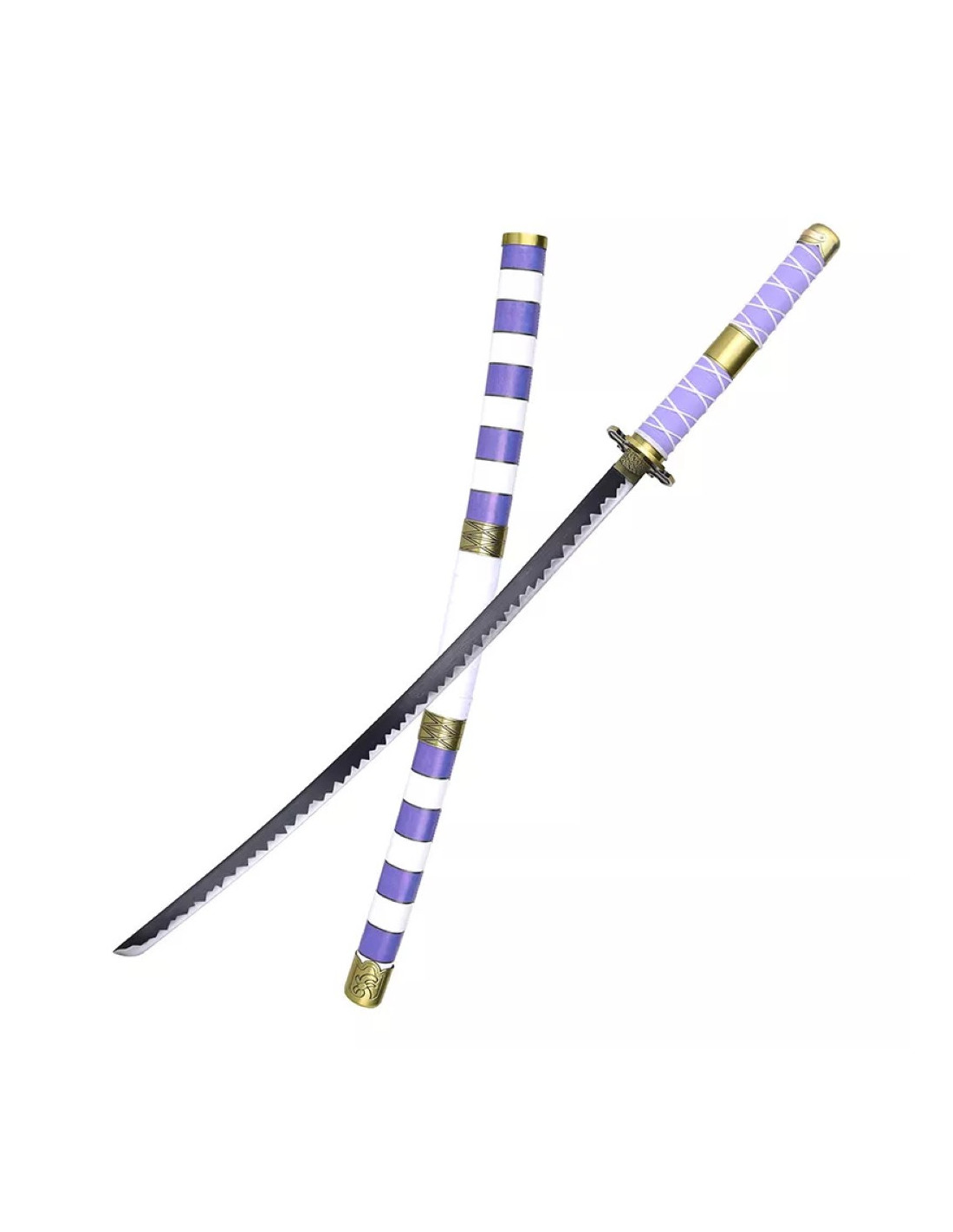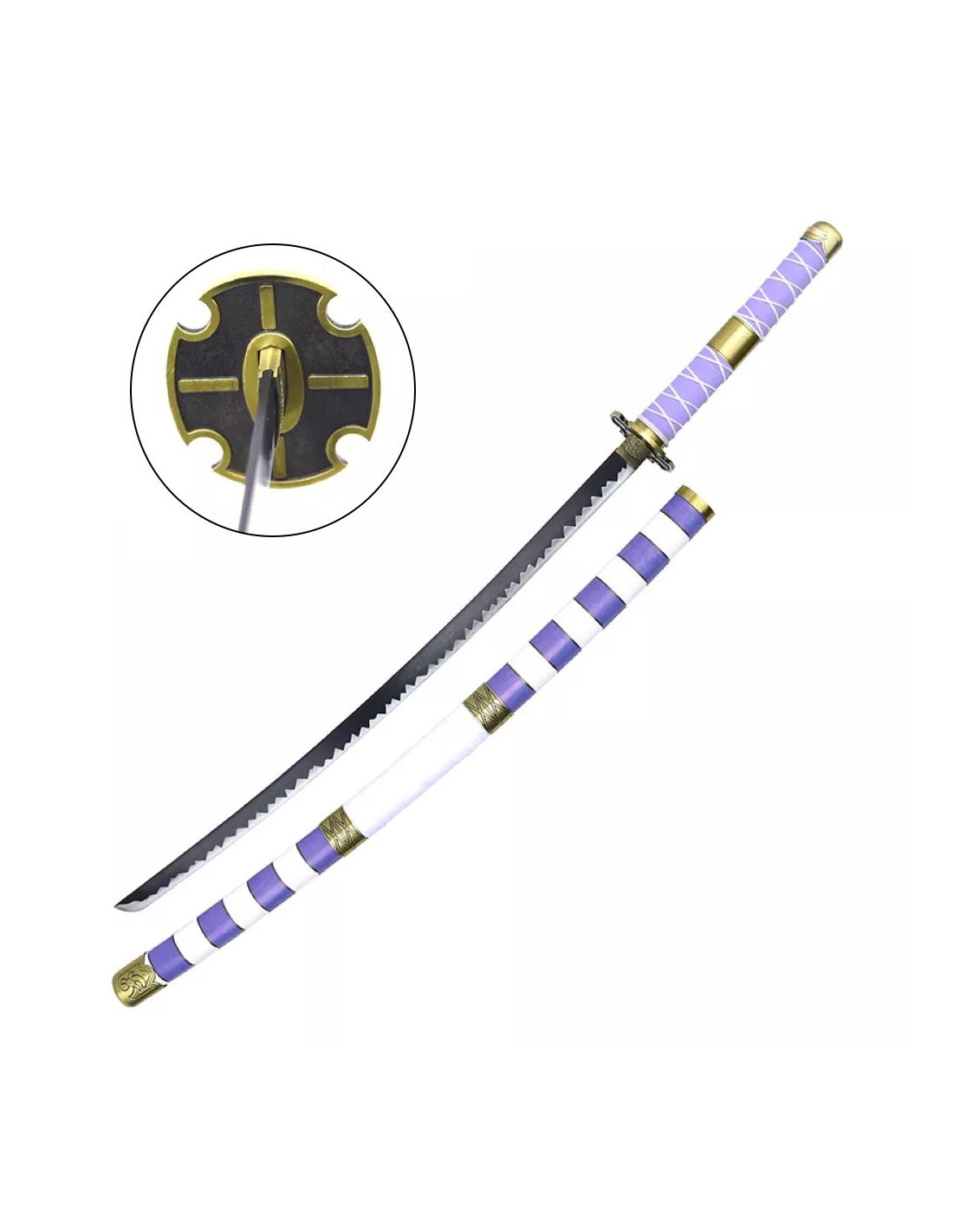 Roronoa Zoro's katana uit One Piece is een indrukwekkend decoratief object dat elke fan van Japanse manga zal bekoren. Dit zwaard is gemaakt met een gedecoreerd koolstofstalen mes, waardoor het een authentieke en traditionele uitstraling heeft. Daarnaast heeft hij een metalen tsuba en een houten handvat wat hem nog authentieker en opvallender maakt.