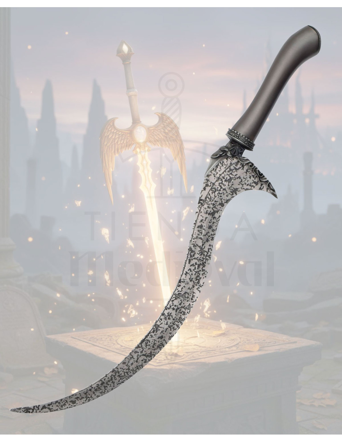 De gebogen en spitse kling biedt een dramatische aanwezigheid die elke vitrine of verzamelhoek in het middelpunt van de aandacht verandert. De gespikkelde textuur in grijs- en zwarttinten voegt visuele diepte toe, waardoor een verouderde en bewerkte uitstraling ontstaat die de decoratie zonder extra accessoires versterkt. Het ornamentale reliëf nabij de handgreep voegt een ambachtelijk detail toe, perfect voor wie op zoek is naar een stuk met persoonlijkheid en karakter.