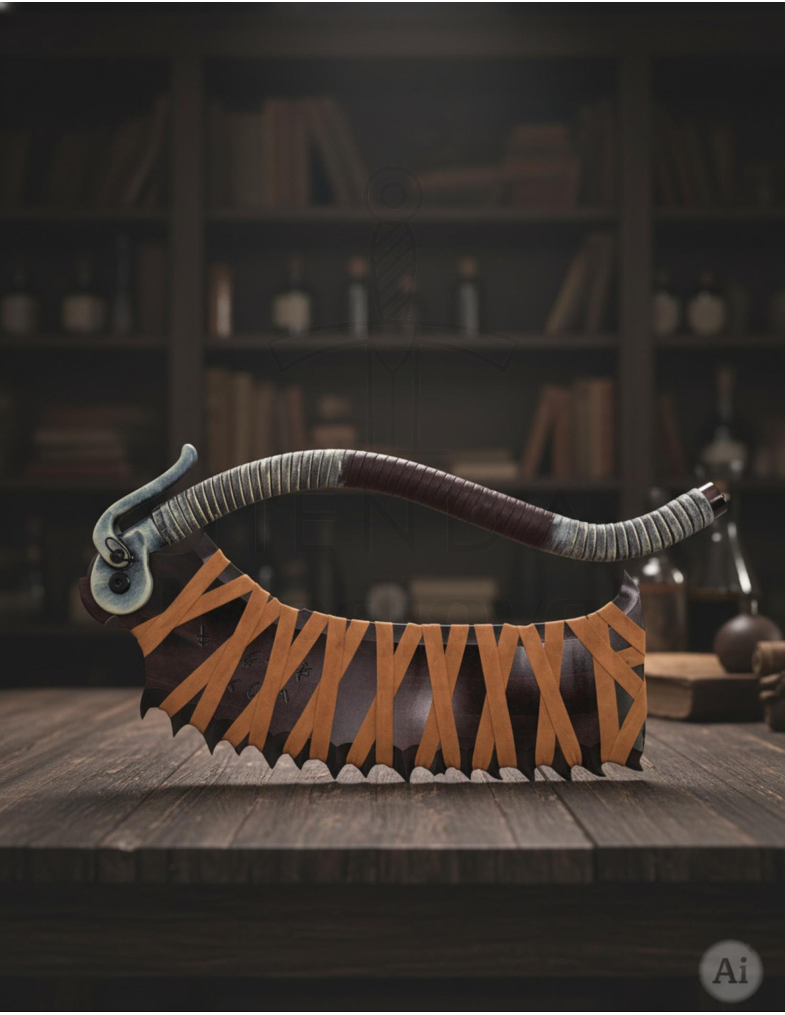 Met een totale lengte van 103 cm reproduceert dit stuk met grote details de vorm van een getande blad en een gebogen handvat, met een verweerde uitstraling op zowel het blad als het handvat die het verouderde en intens gebruikte uiterlijk versterken. Het donkere oppervlak, met zichtbare textuur en een verweerde afwerking, combineert met lichtbruine banden die kruisen, waardoor een zeer realistisch effect ontstaat.