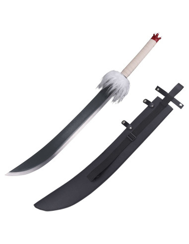 Met een stalen blad van 650 mm, valt het lange, gebogen ontwerp op door een metalen afwerking in donkere tinten, wat een robuuste en authentieke uitstraling geeft. Het houten handvat, omwikkeld met textiel, biedt niet alleen een comfortabele en veilige grip, maar wordt ook afgewerkt met een elegant wit bontversiering die de mythische esthetiek van het personage oproept. De zwarte kunstleren schede met stevige riemen maakt het gemakkelijk om het stuk te vervoeren en te beschermen, ideaal voor cosplay of het decoreren van je ruimte met stijl.