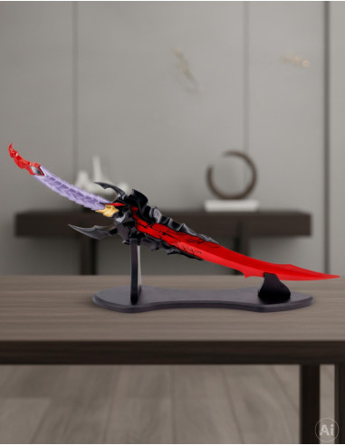 Het blad, met een dikte van 4 mm, heeft een afwerking die fijne zwarte en rode details combineert, met een basis die klauwen of uitsteeksels nabootst, wat zijn ontembare karakter benadrukt. Inclusief een standaard die het gemakkelijk maakt om het te tonen in elke ruimte, vormt het een ideaal accessoire voor decoraties of thematische collecties. Perfect om je kamer, kantoor of speelruimte te decoreren, combineert dit stuk visuele kwaliteit met een indrukwekkend ontwerp, speciaal gemaakt voor degenen die hun passie voor Solo Leveling willen tonen zonder dat het functioneel voor gevechten is. De afbeelding toont een object met een verfijnd en agressief ontwerp, met levendige kleuren en details die zijn fantastische en heroïsche karakter versterken. Bemachtig deze spectaculaire decoratieve zwaard en breng de kracht van het Kamish-universum in je omgeving!