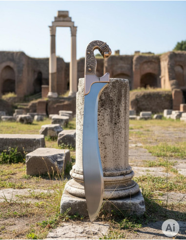De Bronzen Iberische Falcata valt op door zijn authentieke en gedetailleerde ontwerp, dat een getrouwe weergave is van de essentie van de wapens die werden gebruikt door de oude Iberische krijgers. Het roestvrijstalen mes garandeert een uitzonderlijke duurzaamheid, terwijl het versierde handvat een vleugje elegantie en onderscheid toevoegt.