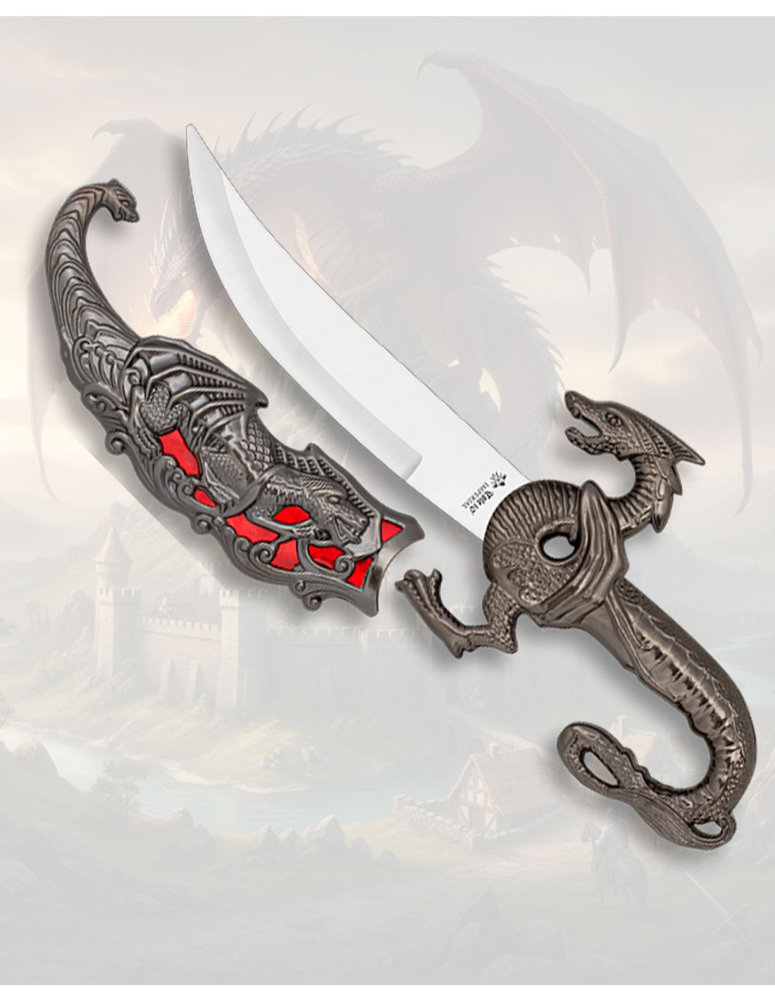 Verpakt in een gekleurde doos, komt het klaar om cadeau te geven of te tonen, en zijn ornamentale ontwerp maakt het een perfecte optie voor verzamelaars, fantasy-liefhebbers, re-enactors en fotosessies. Het stuk roept mythologische symboliek op, verbindt met de verbeelding van de draak als figuur van macht en mysterie, zonder afhankelijk te zijn van een specifieke licentie.