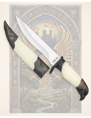 De knop in de vorm van een adelaarsh hoofd, en de metalen verstevigingen op de schede met reliëfs van de vogel, maken het geheel af met een onderscheidend teken dat waardigheid en traditie uitstraalt. Als je geïnteresseerd bent in het kopen van de Middeleeuwse Dagger Model Adelaar Verouderd Zilverkleurig als verzamelobject of om een thematische ambiance te voltooien, dan maakt het narratieve ontwerp en de verouderde afwerking het een natuurlijke keuze.