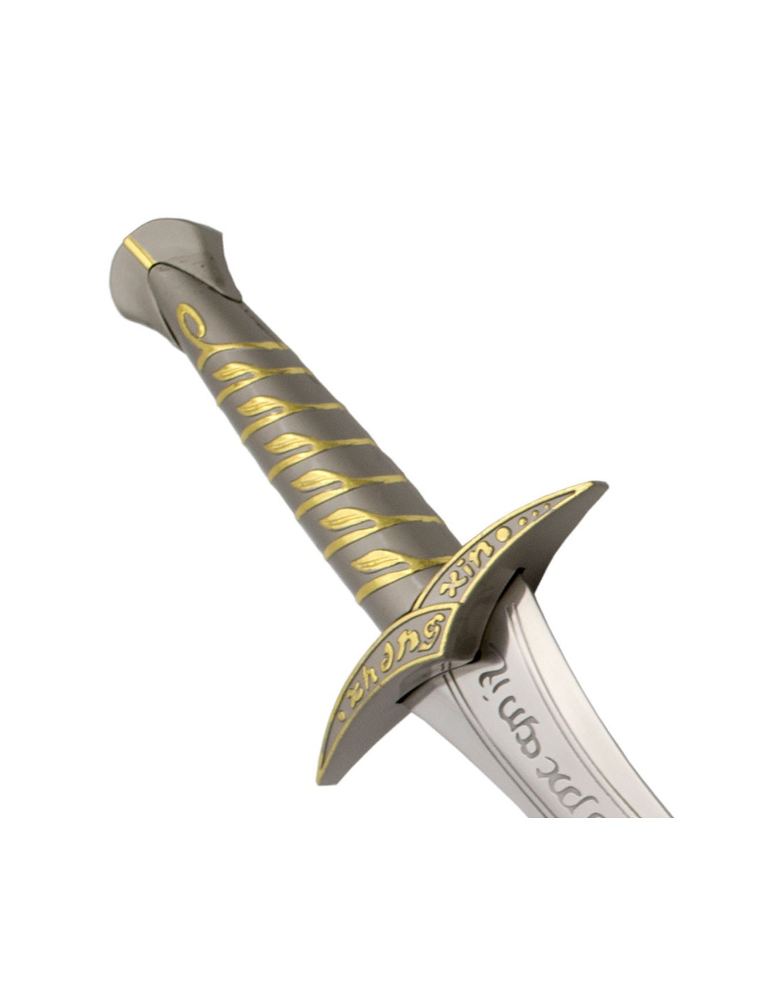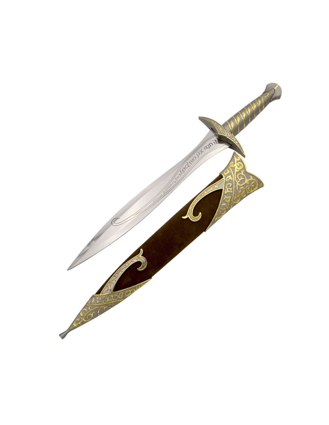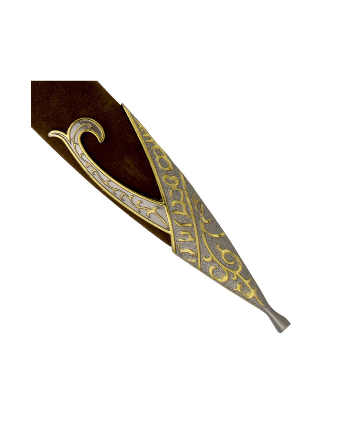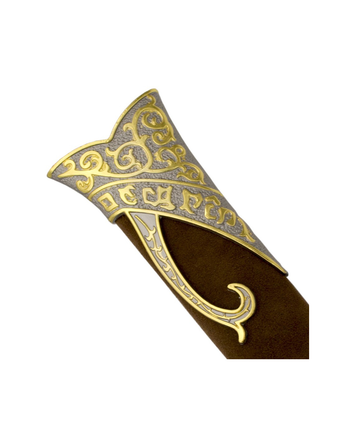De bruine omhulsel versierd met metallic coatings benadrukt de elegantie en het mysterie van deze gevel en geeft een speciaal tintje aan uw verzameling fantastische objecten. Of je nu een onderscheidend element aan je huis wilt toevoegen of gewoon wilt genieten van de fascinatie van het middeleeuwse, dit mes is de perfecte keuze.