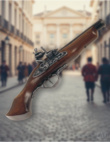 Met zijn gemiddelde afmetingen van 32 cm lang is dit pistool perfect voor wie op zoek is naar een authentiek stuk van hoge kwaliteit. Het ontwerp in hout en gegoten en gepolijst metaal geeft het een unieke en verfijnde uitstraling.