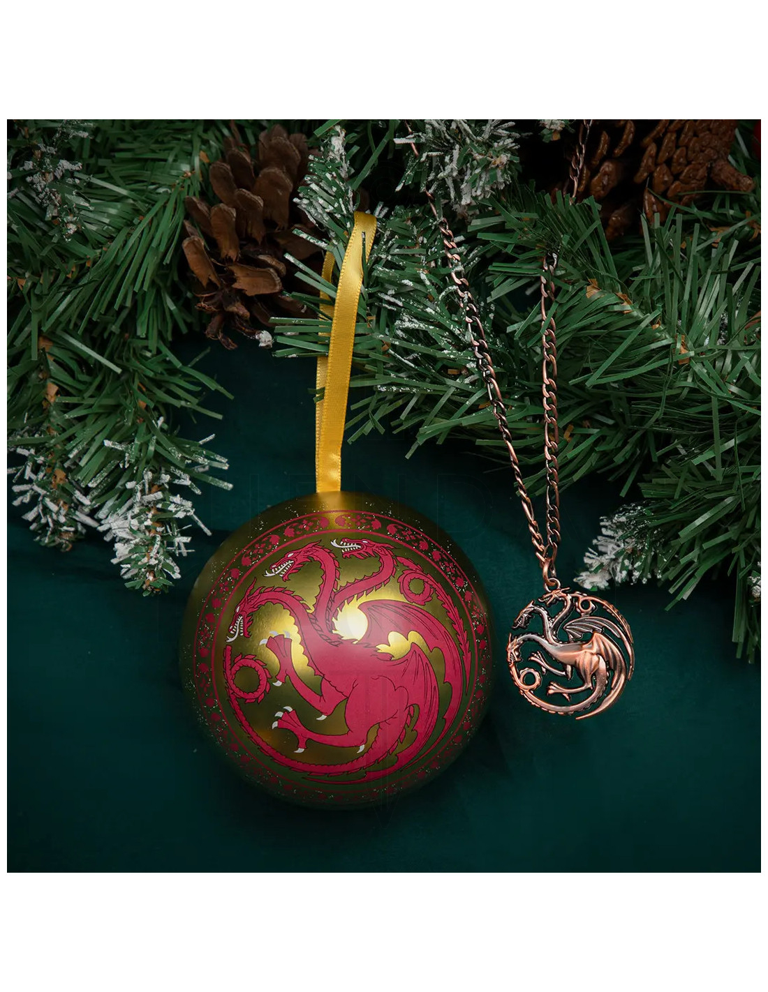 Het ontwerp combineert een gouden decoratieve bol met donkere rode accenten en een ronde hanger in koper- of bronskleuren, beide met de iconische drie-koppige draak. Die mix van warme glans en donkere details geeft een aura van mysterie en autoriteit, perfect voor wie aanwezigheid wil uitstralen zonder een woord te zeggen.