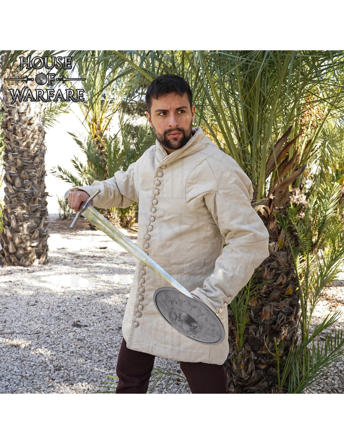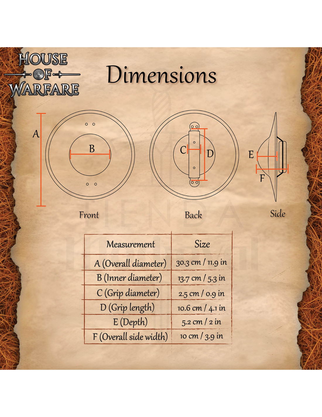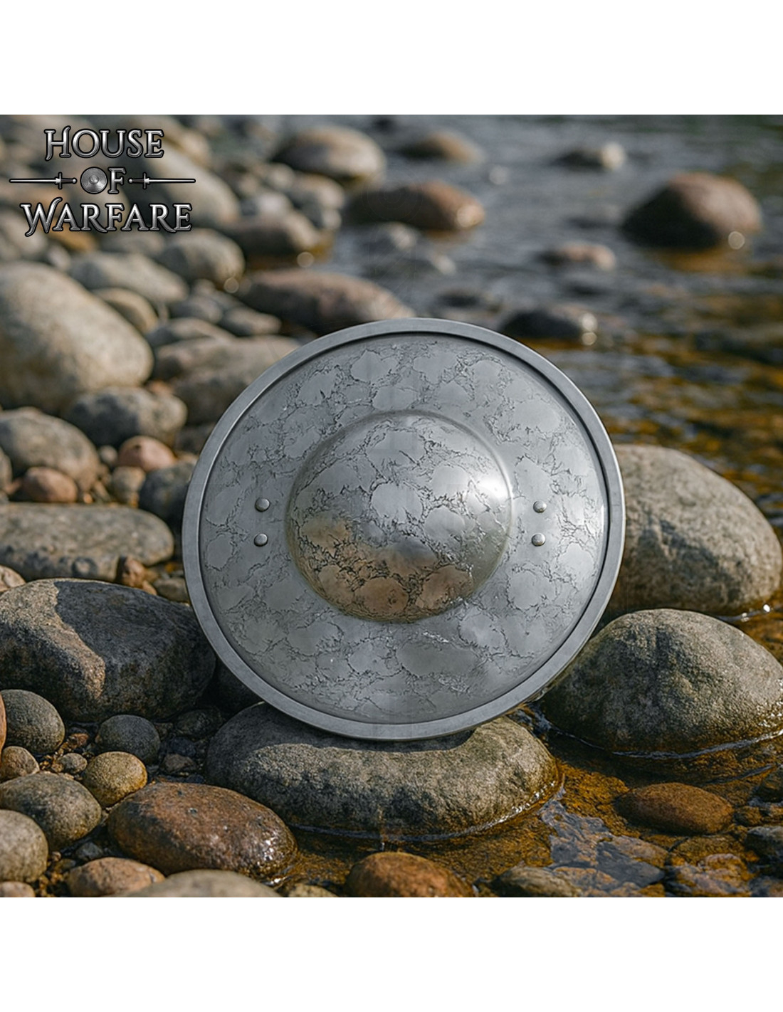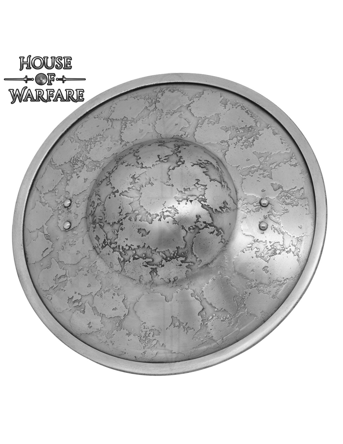 Deze functionele middeleeuwse schijf in staal met geklonken handvat biedt een authentieke uitstraling zonder in te boeten op wendbaarheid, dankzij de gesmede constructie die weerstand biedt en een solide gevoel geeft bij het blokkeren of afleiden van aanvallen. De centrale koepel voegt niet alleen een historisch uiterlijk toe, maar concentreert ook impact en stelt je in staat de afstand te controleren met nauwkeurige bewegingen.