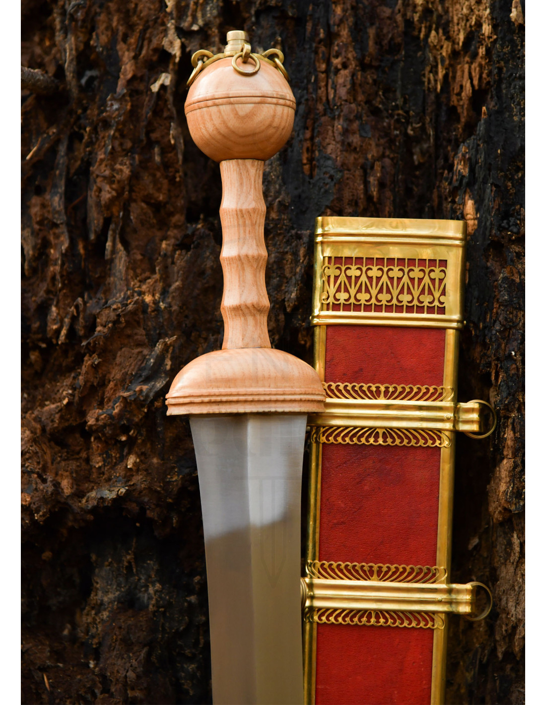 De decoratieve details maken het verschil: vier bronzen ringen aan de bovenkant van de handgreep en een messingplaat onder de guard suggereren ceremoniële relevantie of rangonderscheidingen, terwijl de felrode, met goud beslagen schede de Romeinse uitstraling nabootst, waardoor deze gemakkelijk kan worden tentoongesteld of aan een historische riem kan worden bevestigd.