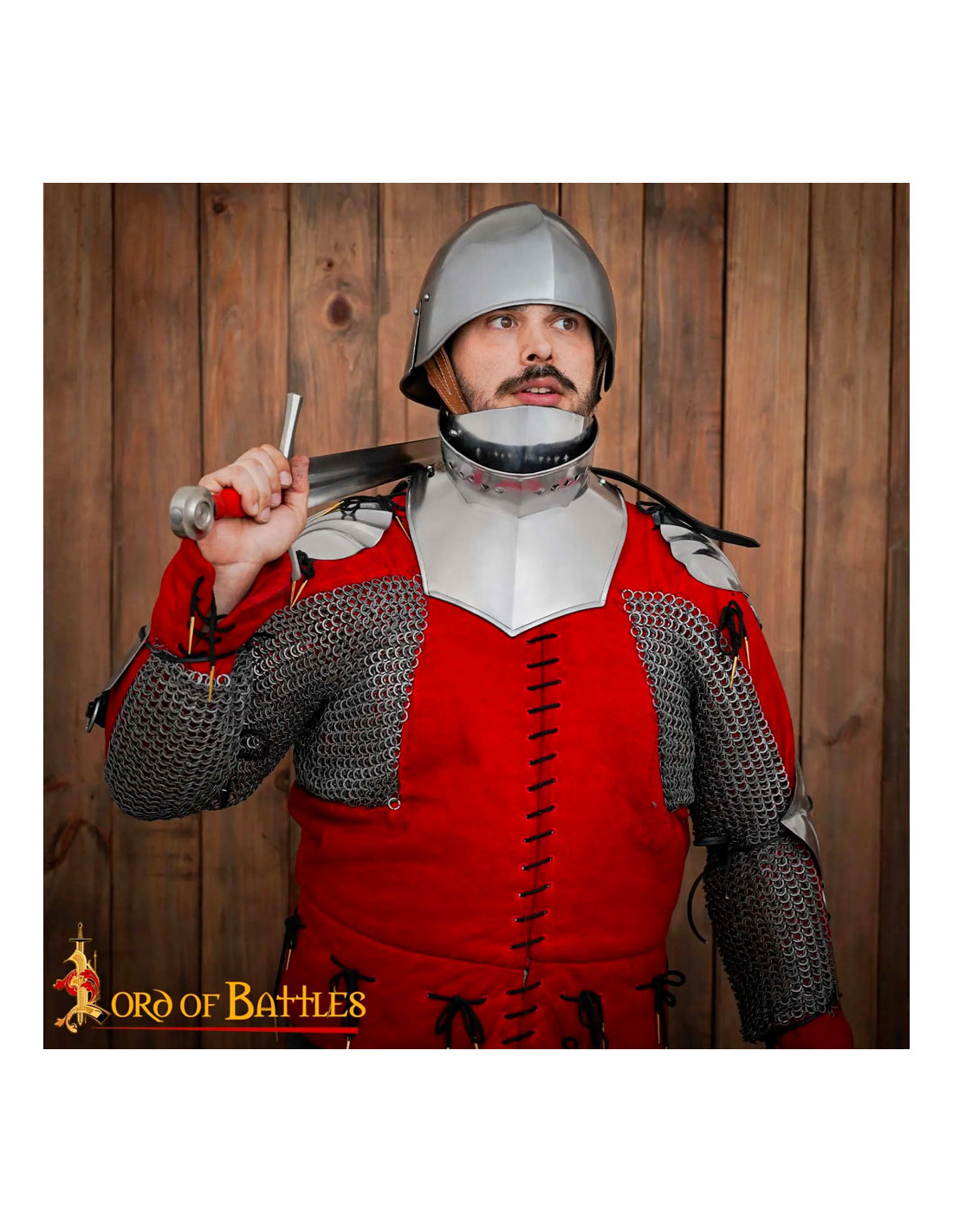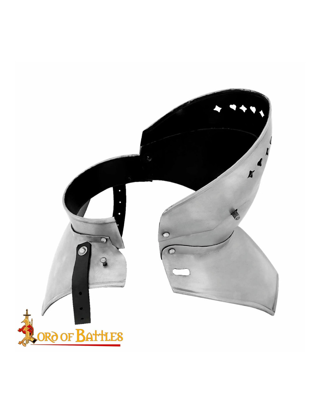 Een volledig gesloten helm zou niet zo efficiënt zijn als deze ridderhalsband in combinatie met zijn trouwe helm! Deze stijl was geliefd bij de meeste zwaar gepantserde ridders vanaf het tweede kwart van de 15e eeuw tot aan de Renaissance, toen de gesloten helm werd geïntroduceerd. Hierdoor kon de drager de helm gemakkelijk verwijderen wanneer deze niet nodig was en bood het aanzienlijke bescherming op het slagveld.