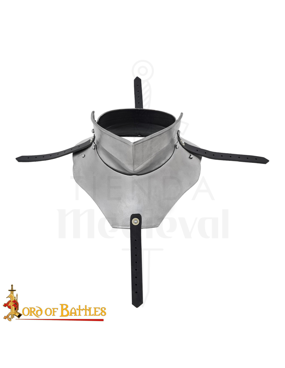 Deze handgemaakte gorjal combineert bescherming en vrijheid, dankzij de beweegbare bevor die het mogelijk maakt de voorplaat met gemak op te tillen, zodat de beweging kan spreken wanneer je het het meest nodig hebt. Het ontwerp bedekt de nek en de bovenkant van de borst, en biedt een gevoel van beveiliging dat niet beklemmend aanvoelt tijdens lange dagen op evenementen of repetities.