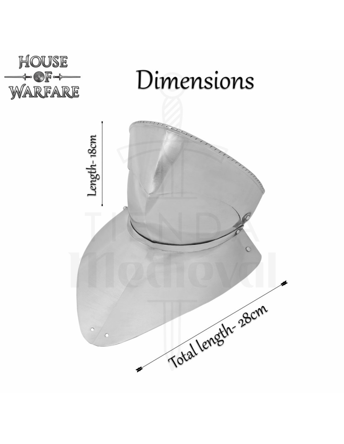 Het ontwerp in gepolijst staal van de authentieke stalen gorget uit de 15e eeuw met barbote biedt een visuele aanwezigheid die de aandacht trekt, terwijl de versterkte randen en klinknagels zorgen voor betrouwbare veiligheid, zonder in te boeten op de metalen en blinkende esthetiek die je van een historisch stuk verwacht.