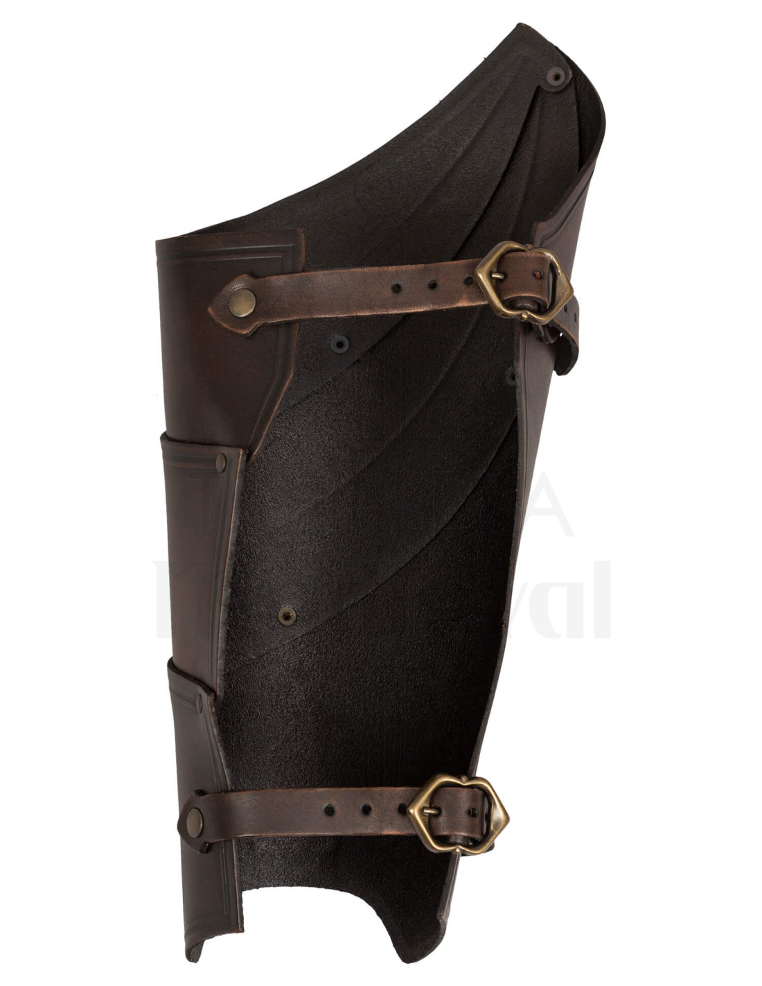 De donkerbruine afwerking benadrukt niet alleen hun klassieke uitstraling, maar geeft ook een vleugje verfijning, klaar om te combineren met verschillende outfits en andere element van harnas. Details zoals de gegraveerde lijnen en de metalen klinknagels geven de scheenbeschermers een robuuste en artistieke uitstraling, waardoor ze een onmisbaar accessoire zijn voor degenen die een krachtige en mysterieuze aanwezigheid willen uitstralen.