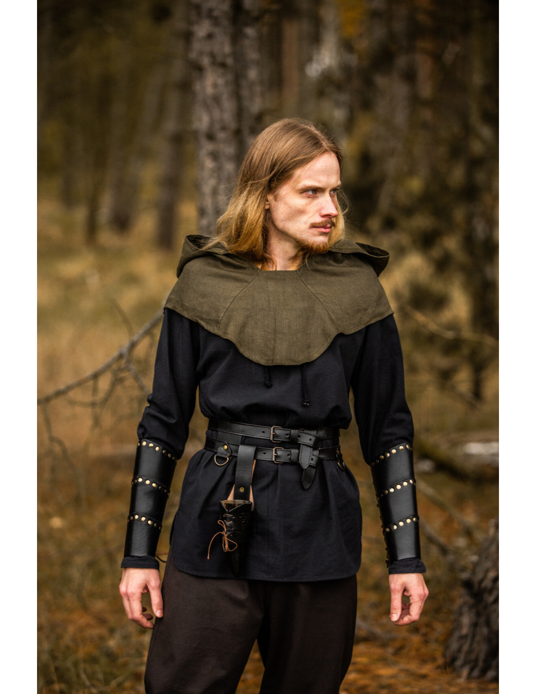 Geïnspireerd door middeleeuwse mode, weerspiegelt deze gugel strakke lijnen en eenvoudige silhouetten, die de geest van een tijdperk van ridders en avonturen oproepen. De rustieke en functionele esthetiek, vergelijkbaar met de kleding van een bosverkenner, wordt aangevuld met details die zijn historische en veelzijdige karakter benadrukken, perfect te combineren met andere middeleeuwse outfits voor een authentieke stijl.