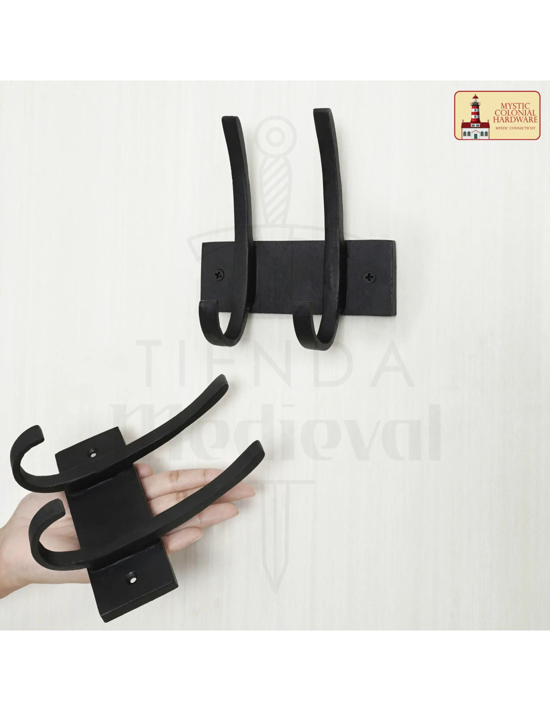 Dit met de hand gesmede stuk geeft een authentieke rustieke uitstraling en een gevoel van robuustheid dat je meteen voelt bij de eerste aanraking. De matte zwarte afwerking en de rechthoekige plaat met twee gaten voor schroeven zorgen voor een discrete en stevige bevestiging, terwijl de twee gebogen haken jassen, handdoeken, tassen of hoeden altijd binnen handbereik en van de grond houden.