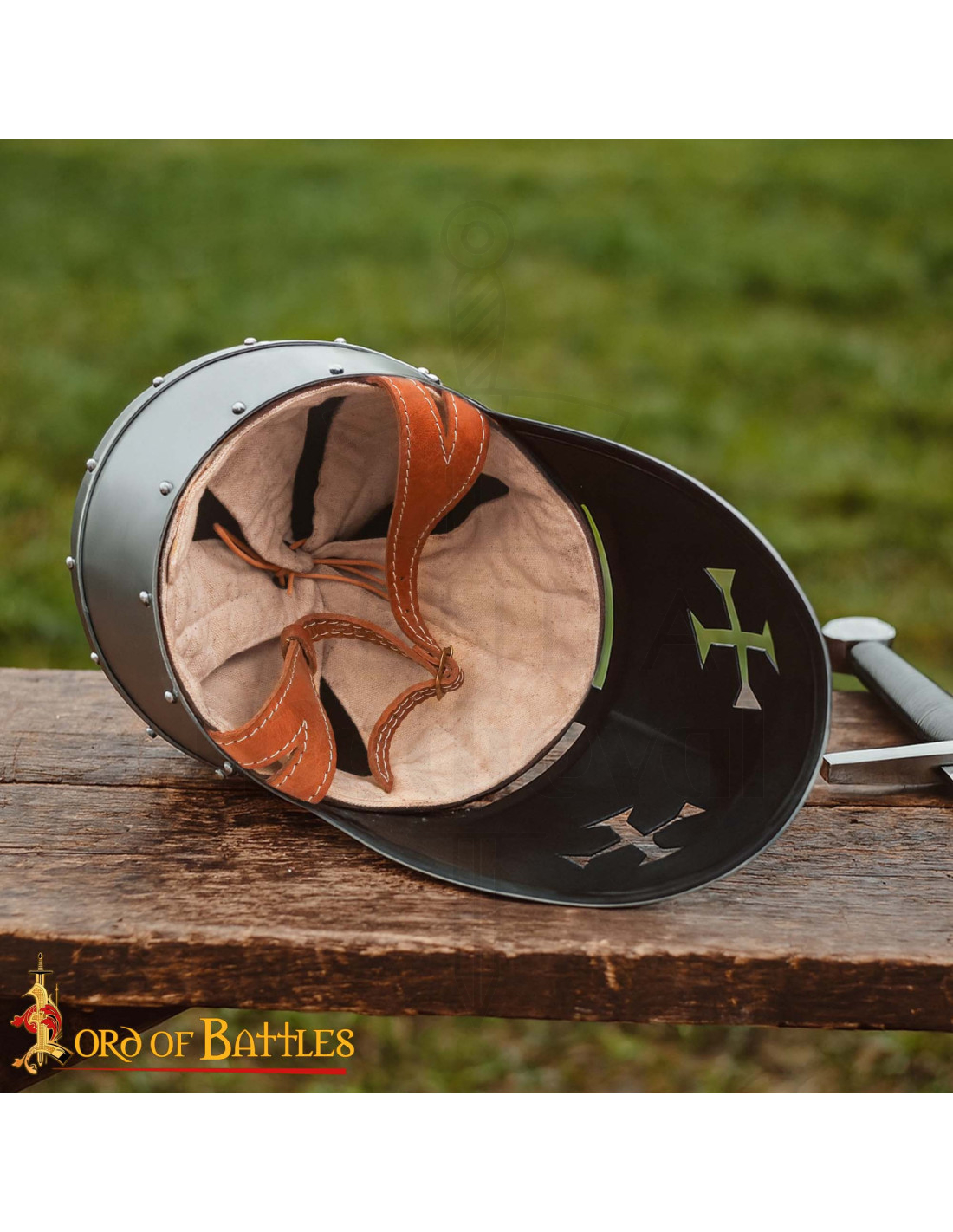 Naast zijn beschermende functie wordt deze helm een duidelijk symbool van identiteit en middeleeuwse ridderlijkheid. Het aanvullen met een mantel en middeleeuwse accessoires versterkt je uitstraling en je historische ervaring. Een onmisbaar element voor wie de heldhaftigheid van de Tempeliers op authentieke en stijlvolle wijze wil herbeleven.
