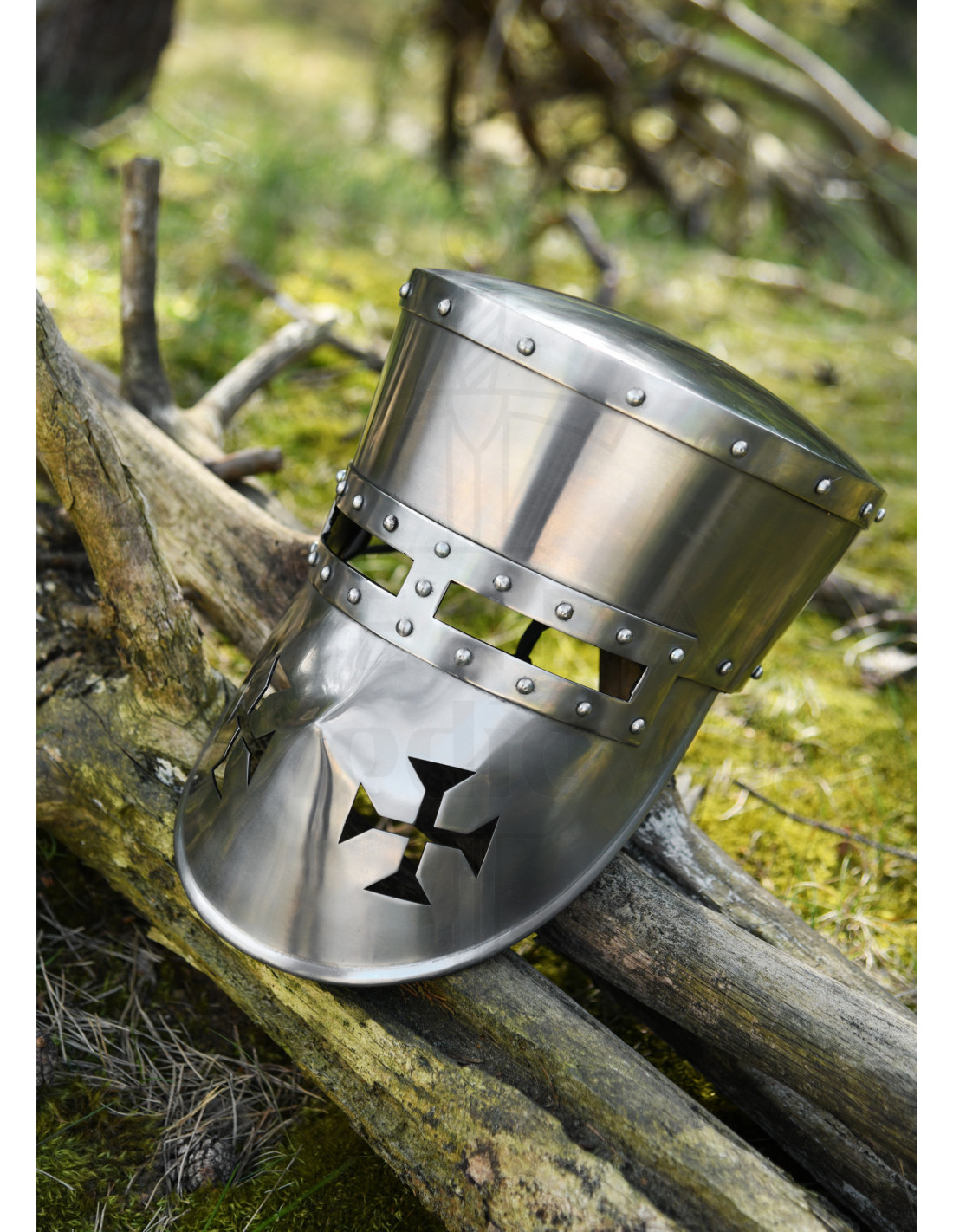 De functionele kruisvaardershelm is ideaal voor liefhebbers van geschiedenis en de middeleeuwen. Als je fan bent van de Kruistochten en de Tempeliers mag deze helm niet ontbreken in je collectie. Het stelt je in staat om de epische veldslagen van die tijd opnieuw te beleven en brengt je rechtstreeks naar een wereld vol moed en eer.