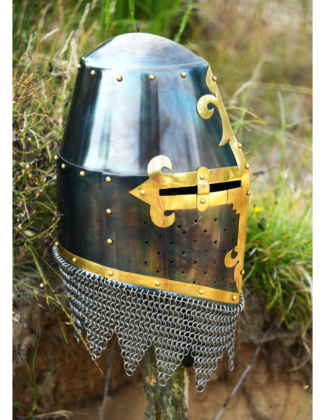 Ontdek de functionele kruisvaardershelm van Rieter Von Kornburg, Neurenberg, jaar 1375, een authentiek juweel met de hand gemaakt in 1,6 mm staal. dik.