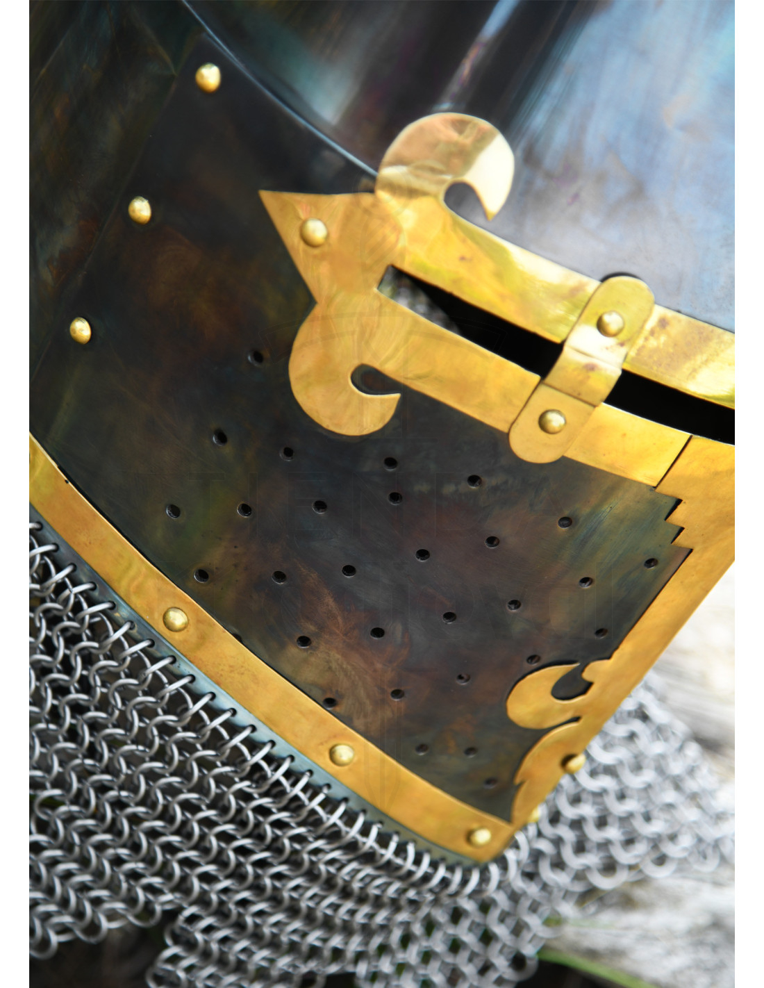 Deze helm heeft alle geklonken stalen onderdelen, wat de weerstand en duurzaamheid garandeert. Bovendien bevat het een maliënkolder die aan de helm is bevestigd, wat extra bescherming biedt zonder aan comfort in te boeten.