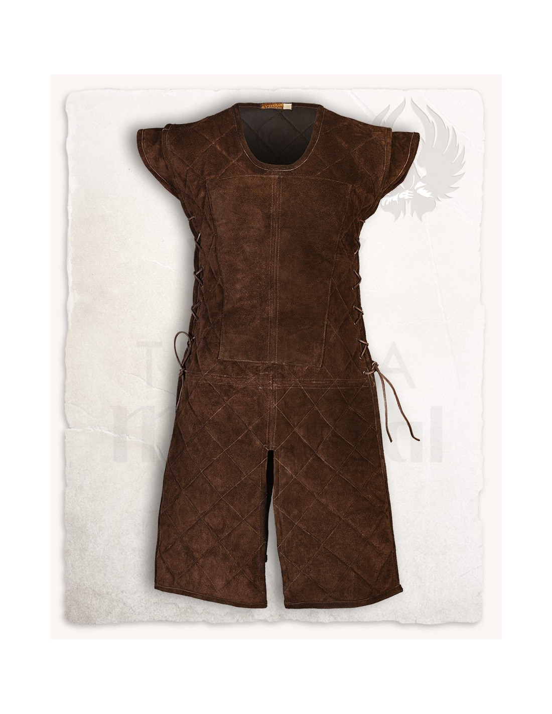 Gemaakt van zacht suede, past deze middeleeuwse harnas als een handschoen, dankzij het systeem van zijveters dat een persoonlijke pasvorm mogelijk maakt. Het ontwerp met ruitvormige naden voegt niet alleen een esthetisch tintje toe, maar verbetert ook de mobiliteit, zodat je vrij kunt bewegen bij elke stap.