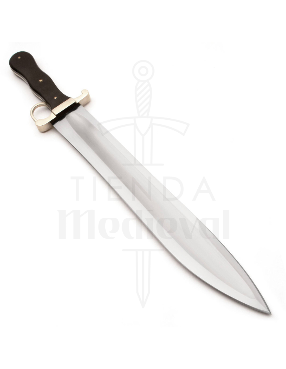 Deze trouwreproductie verandert materialen en ontwerp in echte voordelen: het blad, met een symmetrisch profiel en een speerpunt, biedt precisie bij sneden en effectiviteit bij penetratie, terwijl de gepolijste afwerking de visuele impact versterkt en het schoonmaken vergemakkelijkt om het onberispelijk te houden na elk gebruik of iedere tentoonstelling.