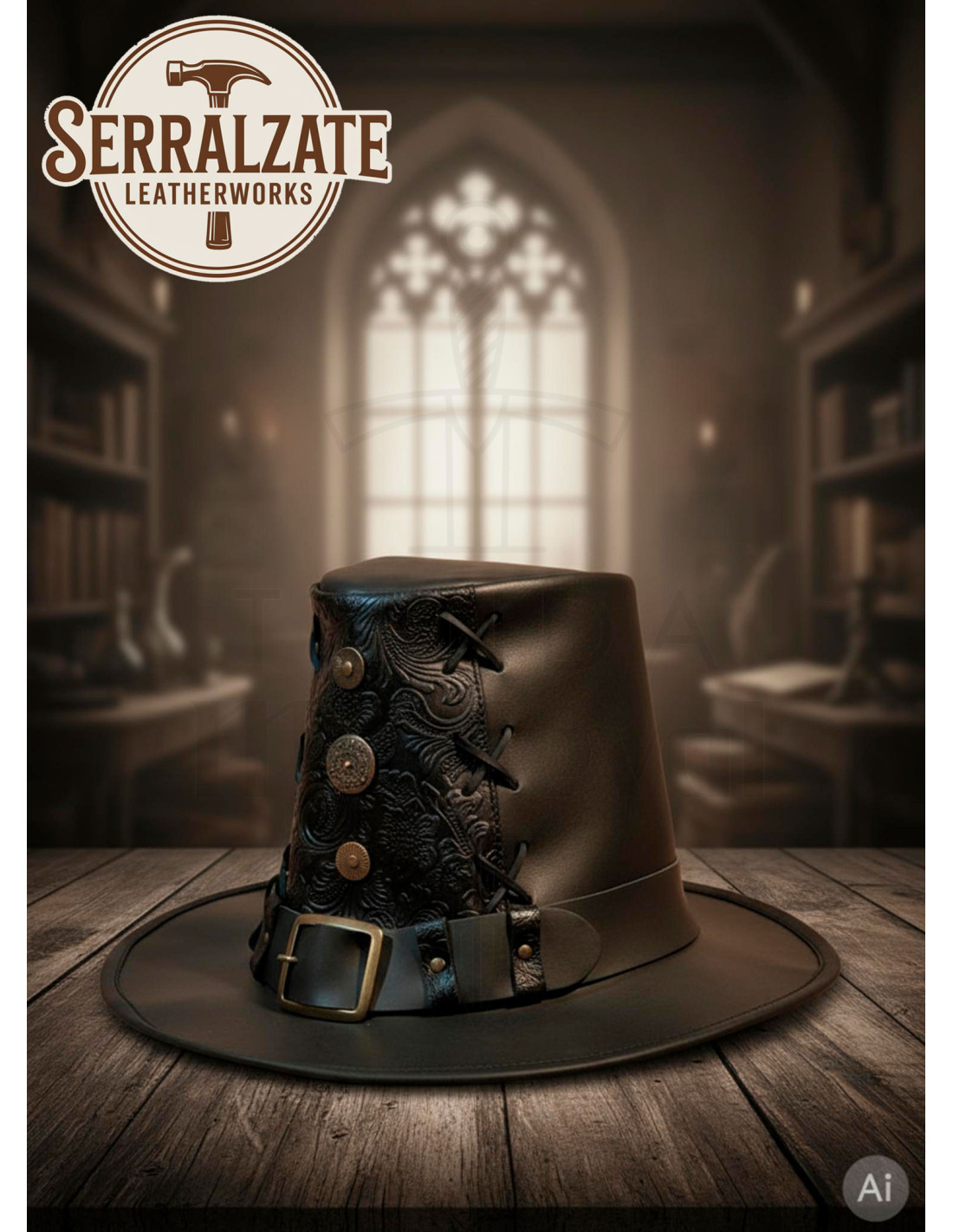 Het zwart geperforeerde leer geeft een authentieke en verouderde uitstraling die elk historisch kostuum versterkt, terwijl de metalen gesp dat onderscheidende detail toevoegt dat de set compleet maakt. De rand bevat een buigbare kabel waarmee je de silhouet kunt bepalen die je verkiest, van een meer klassiek profiel tot een dramatischer uiterlijk, zonder de stevigheid of vorm te verliezen na verloop van tijd.